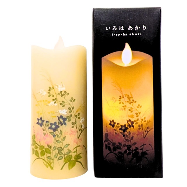 いろはあかりS 秋の七草 単3アルカリ電池2本付 LEDローソク 盆提灯 送料別 本物のロウを使ったリアルな質感と、自然な炎のゆらぎを再現したLEDローソク。 ほのかな灯りに優雅に舞うしだれ桜が浮かびあがります。 サイズがコンパクトで小さなお仏壇にも置いていただけ、盆提灯として対でお使いいただけます。 JAN:4901435213132 サイズ:直径55mm×高130mm ※単3アルカリ乾電池2本付