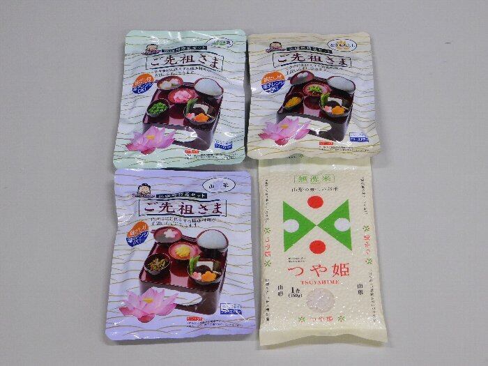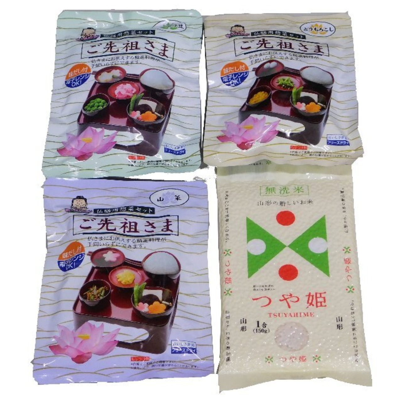 白飯用に山形県産のつや姫をつけました。真空パックなので新鮮なつや姫をお供えできます。無洗米です。