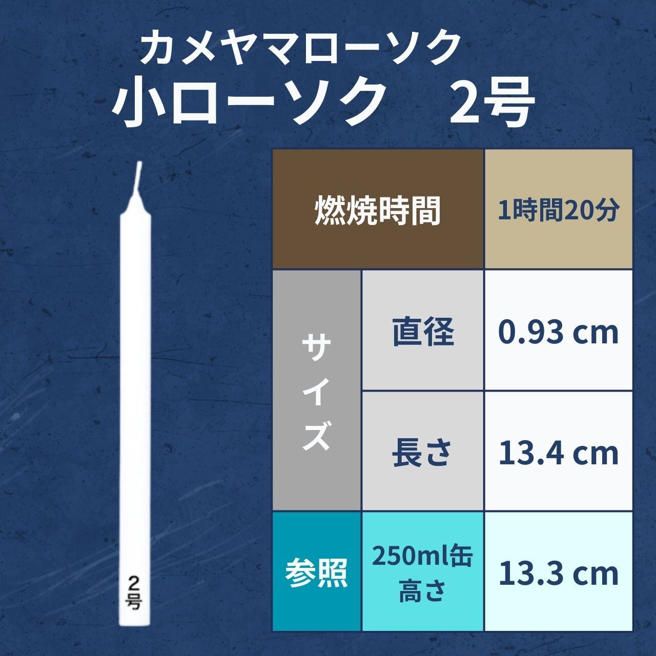 燃焼時間約1時間20分の小ローソク2号。日常のお参りはもちろん、少し長めの読経や法要にも適しています。