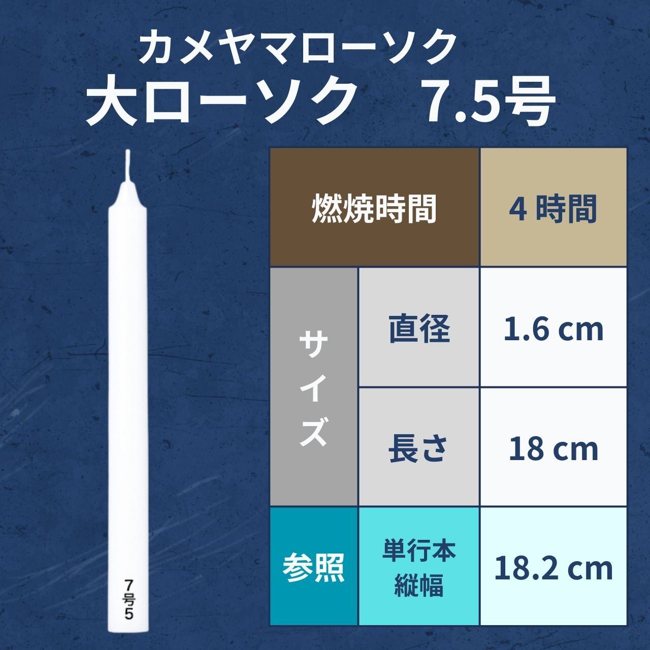 燃焼時間約4時間の大ローソク。年忌法要など、長時間の使用に適しています。