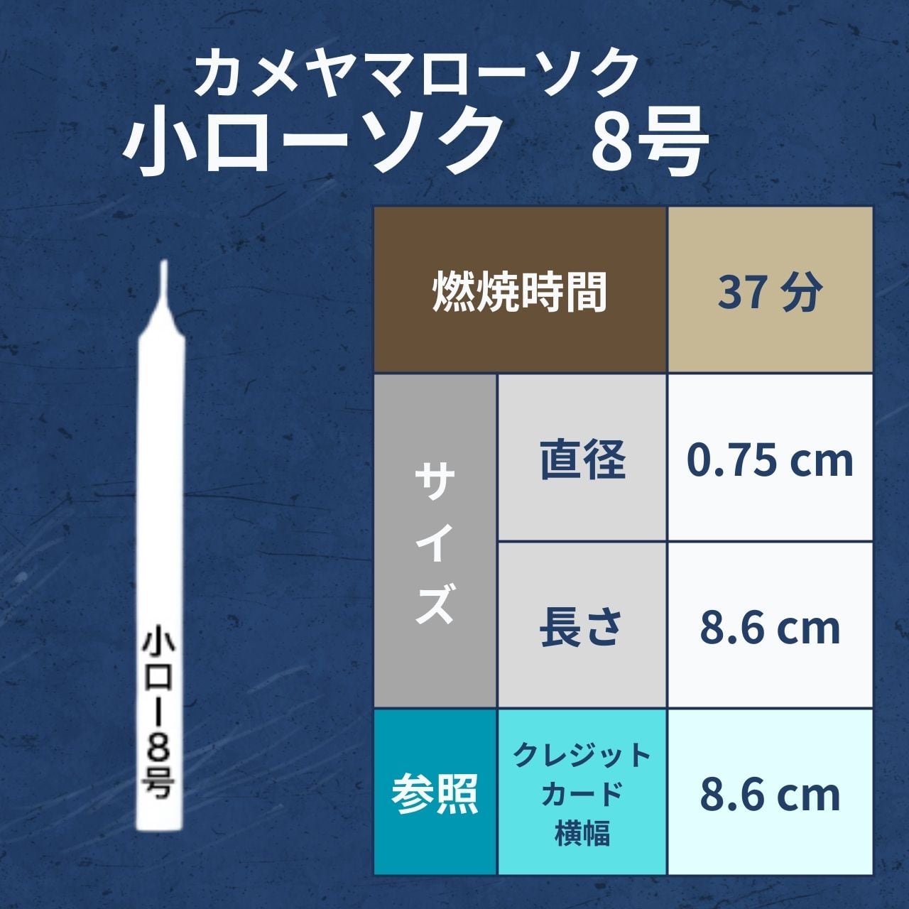 約8.4cmの小ローソク8号。燃焼時間は約37分で、短すぎず長すぎない使い勝手の良さが魅力です。日常使いから法要まで幅広く対応します。