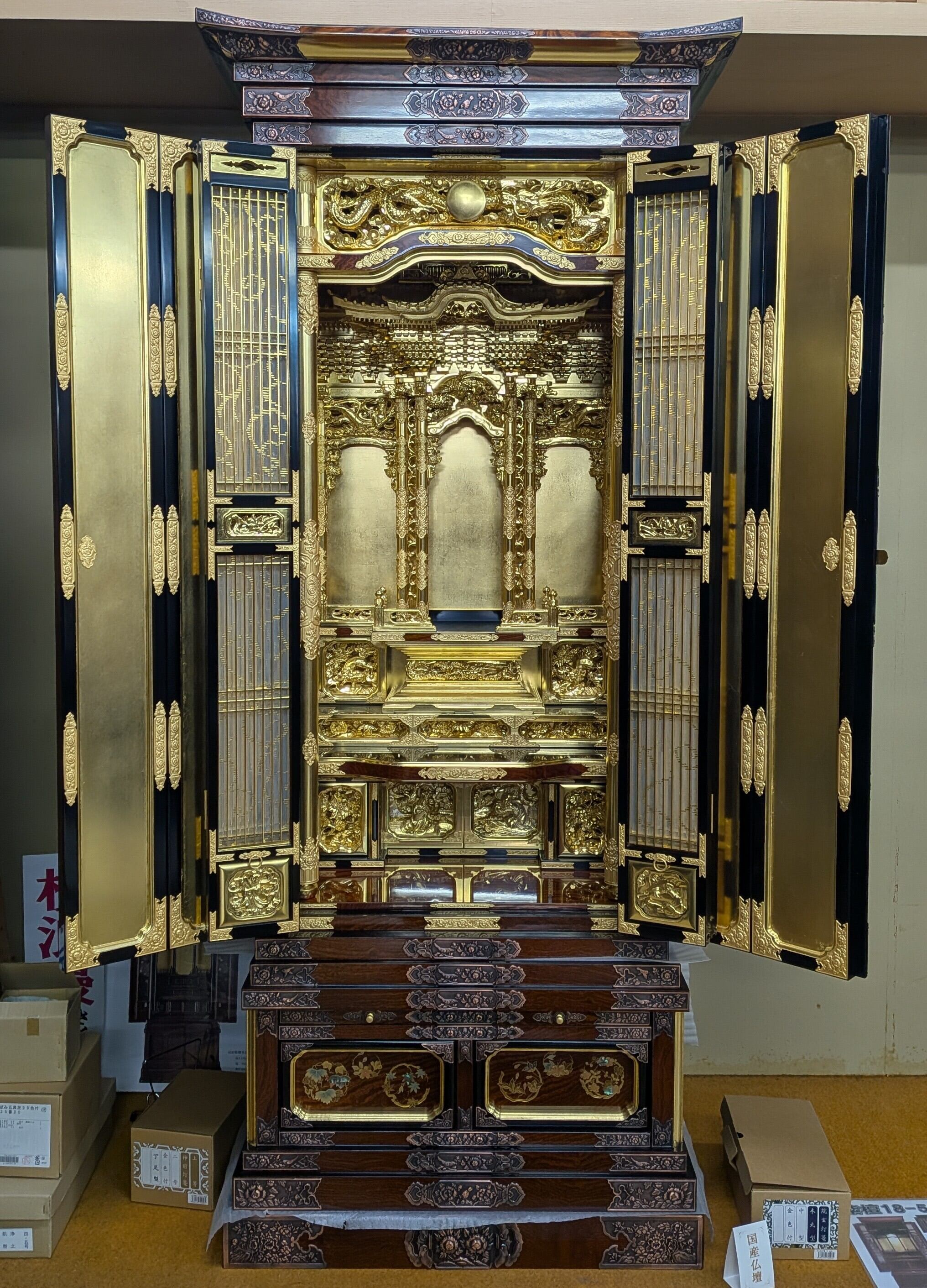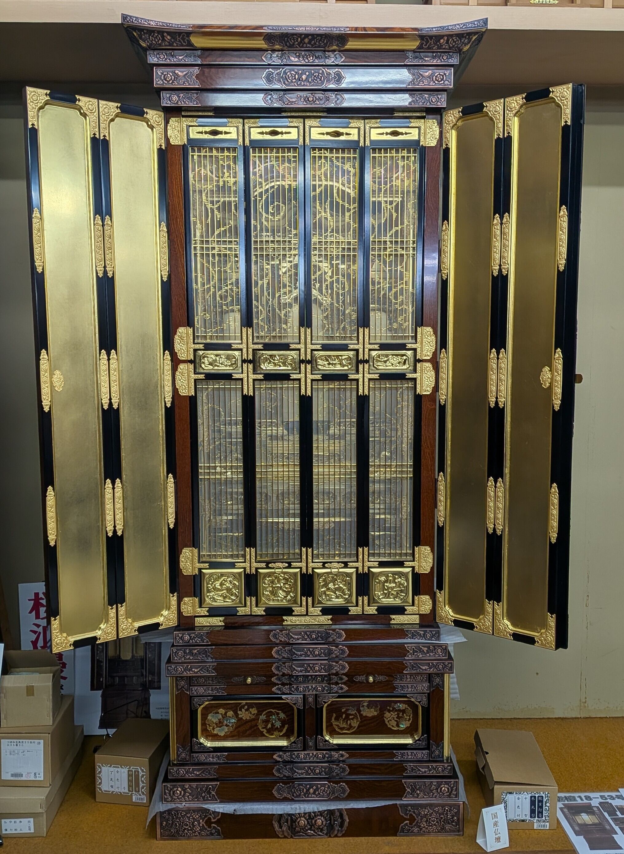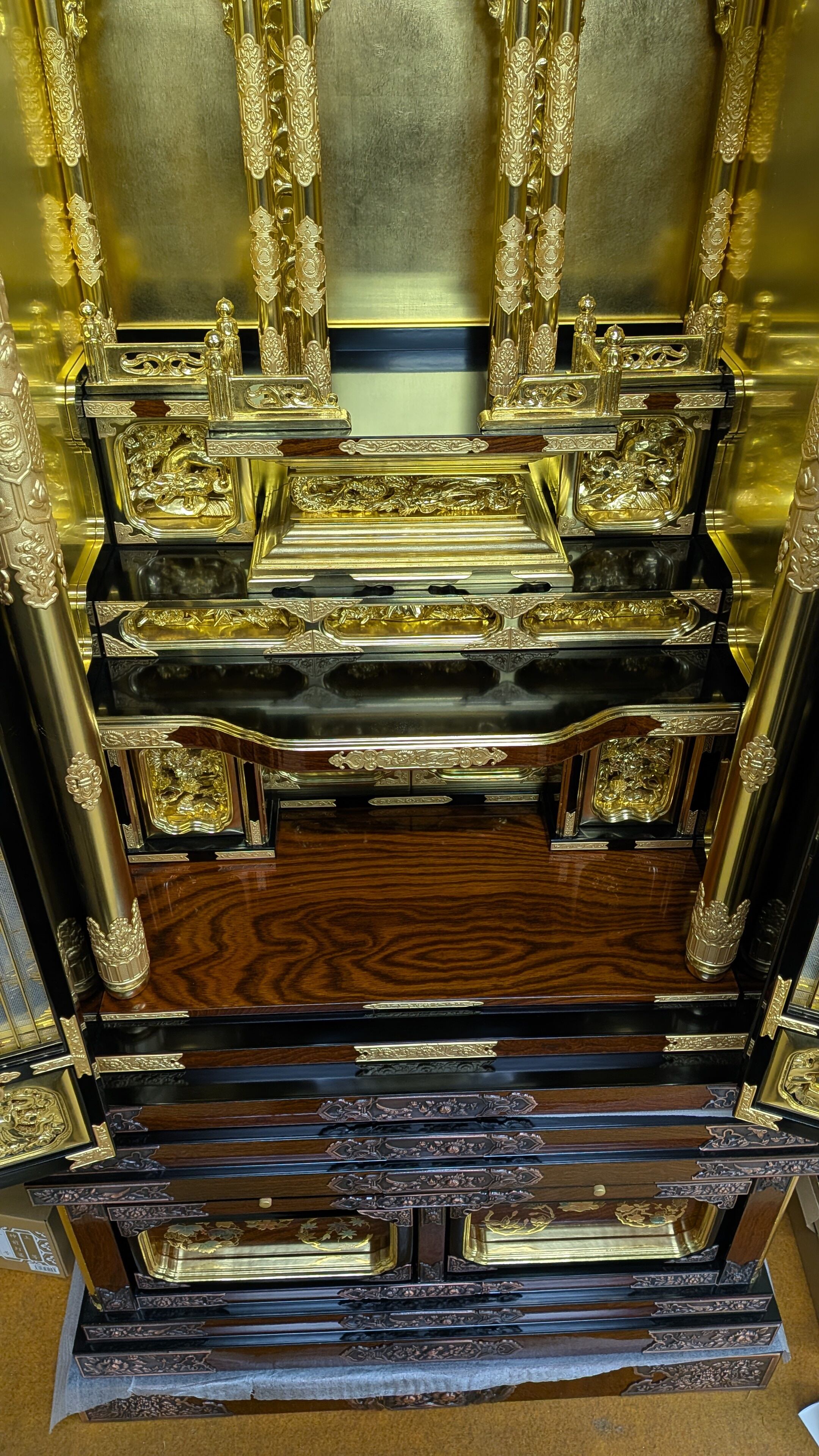 職人の技が光るこの仏壇は、厳選された欅を使用し、時間をかけて丁寧に製造されています。美しい金箔の装飾が施され、どのようなお部屋にも調和し、心に安らぎを与えます。