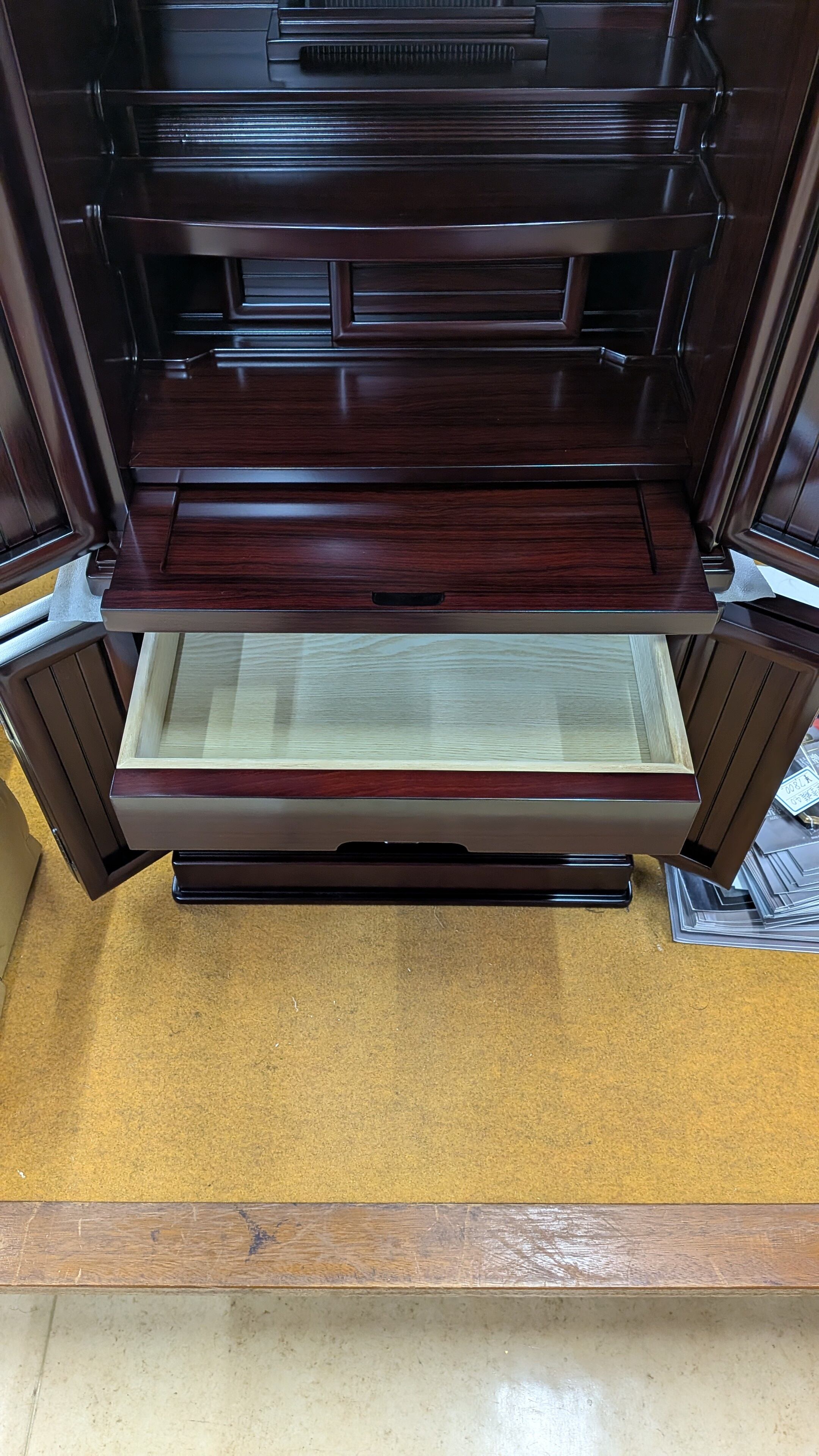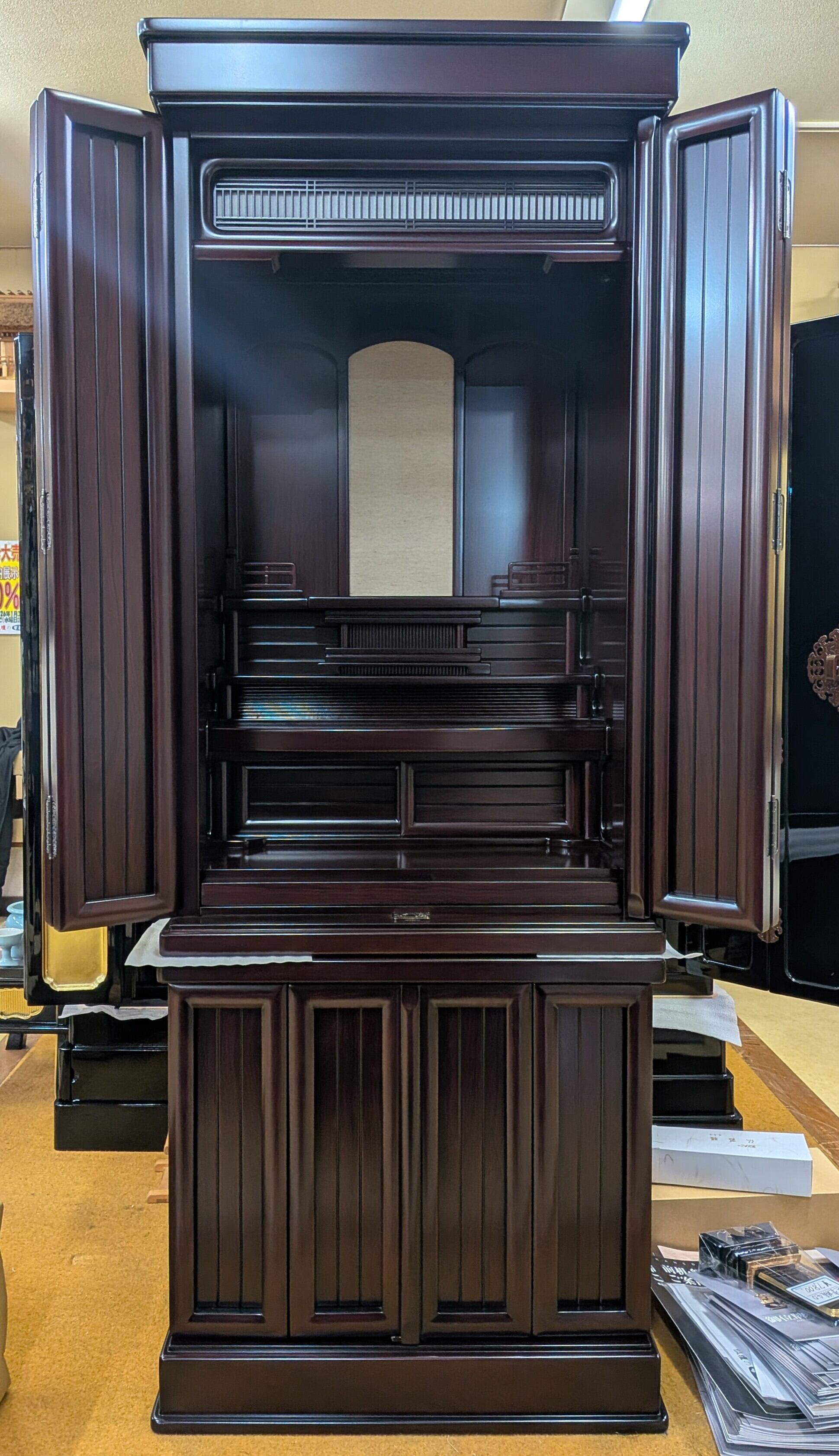このお仏壇は、紫檀調の仕上げが施されており、まるで本物の紫檀を使用しているかのような高級感を演出します。その深い色合いが、心穏やかな空間を作り上げ、日々の心の拠り所となります。