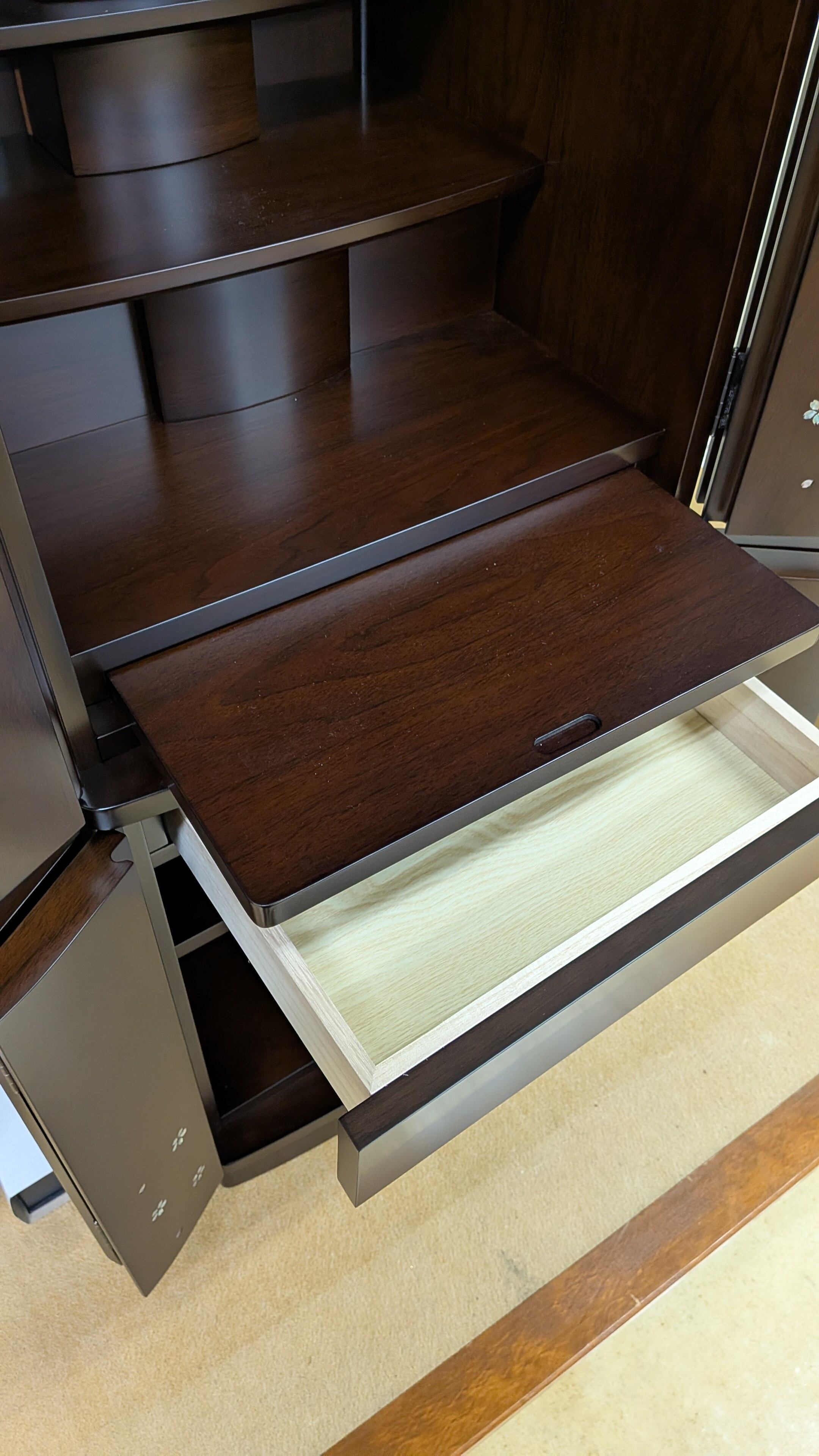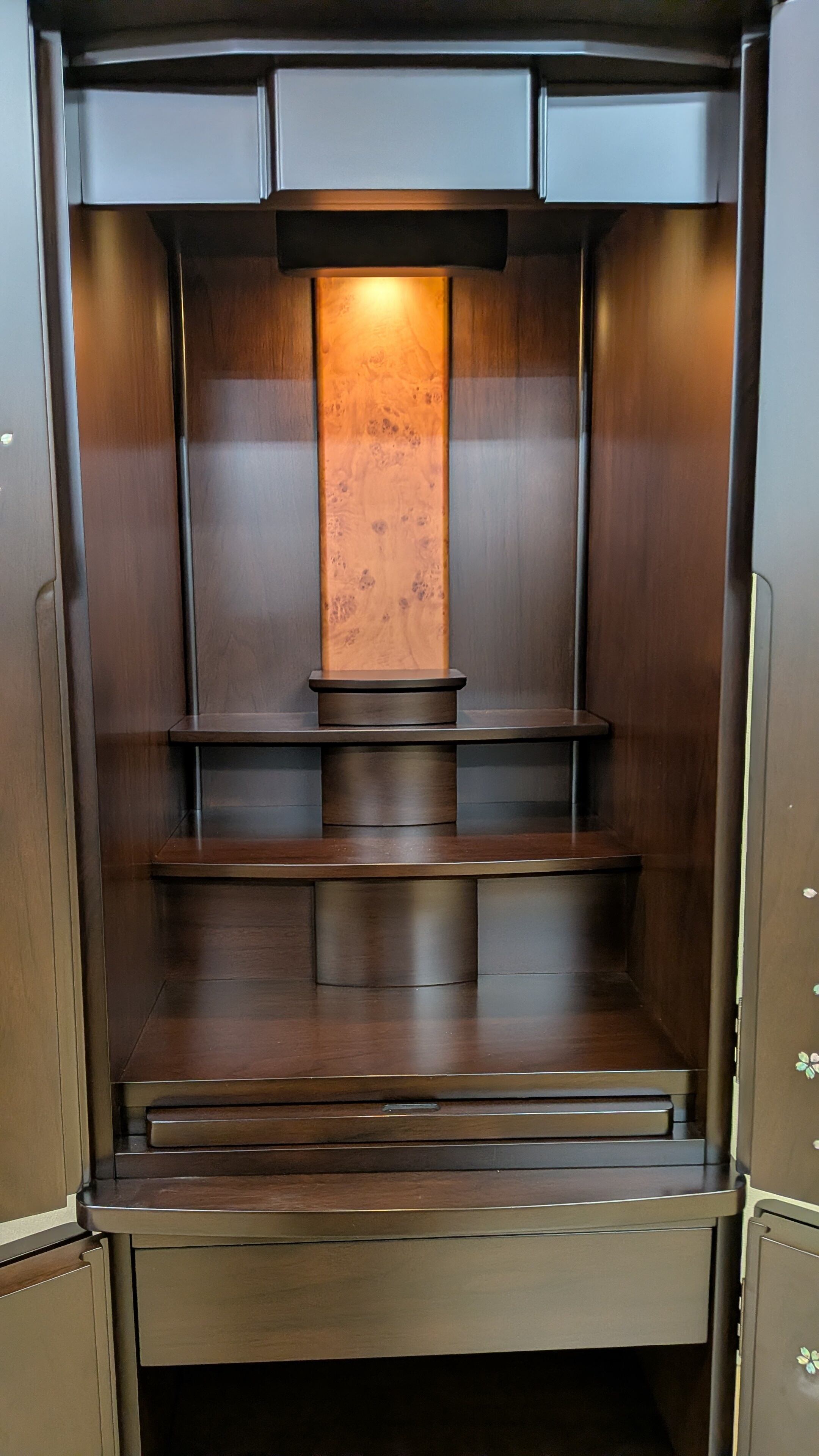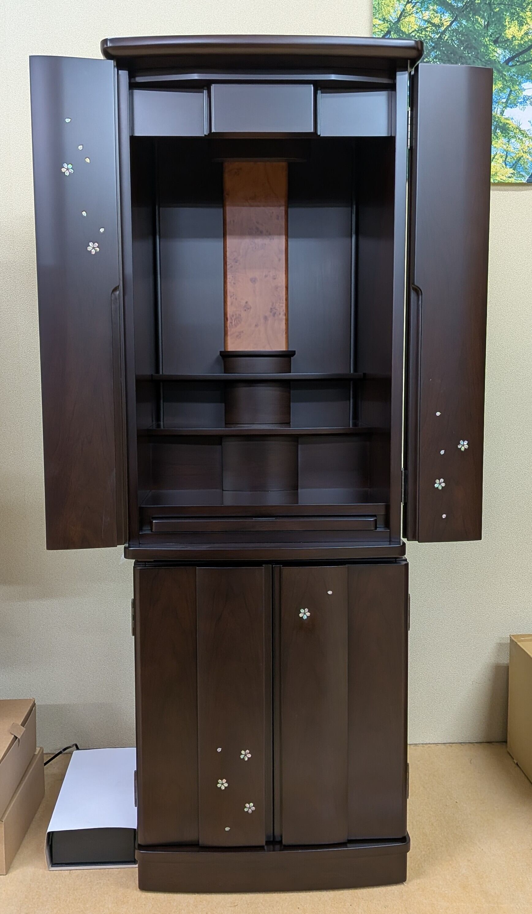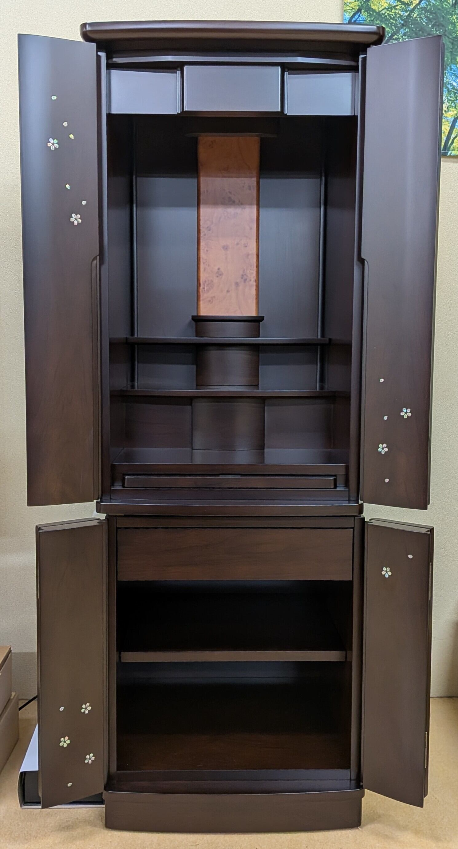 【スペック】高さ:131cm/幅:48cm/奥行:45cm/特徴:桜の螺鈿、仏具付