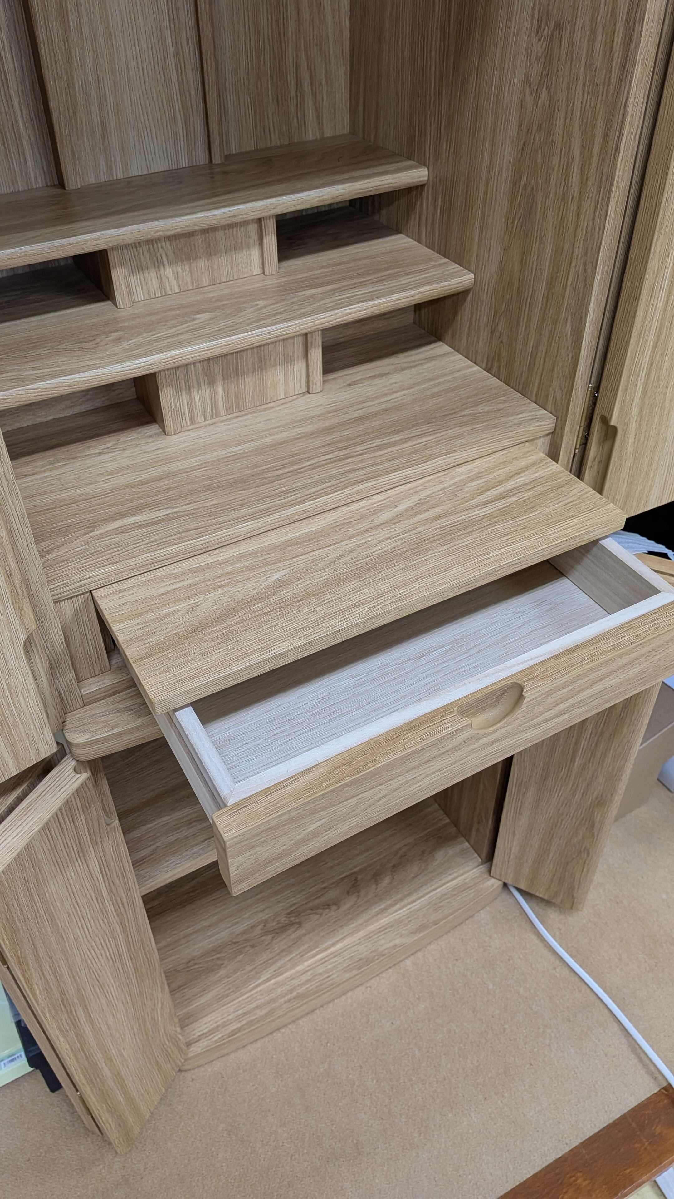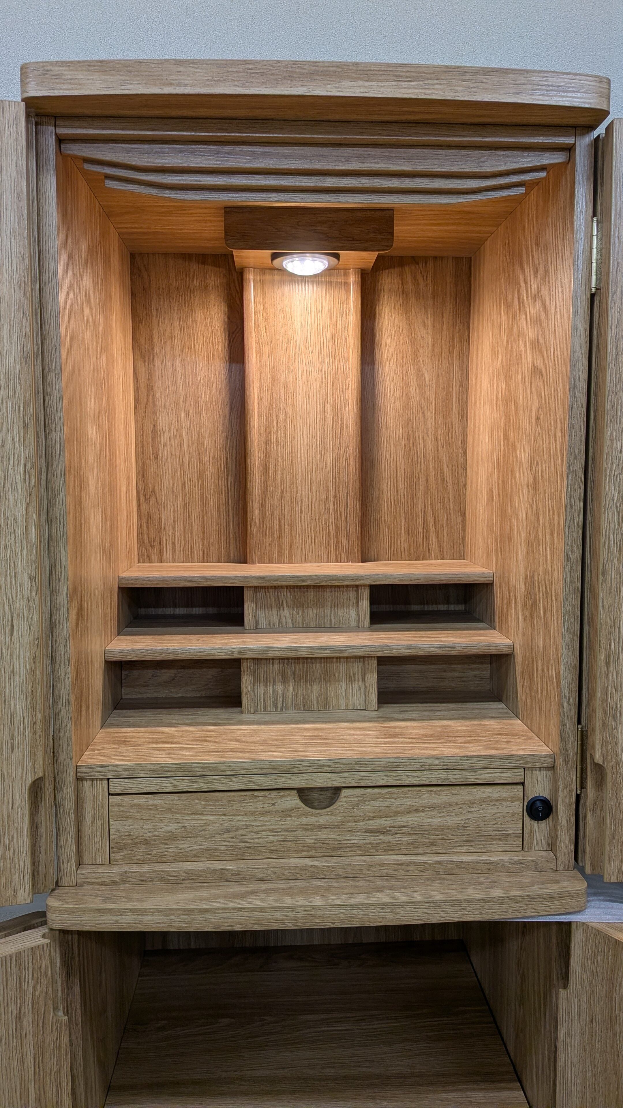 このお仏壇は、ナチュラルな仕上げが特徴で、シンプルなデザインが魅力です。現代的なスタイルはどんなインテリアにも自然に調和し、心温まる癒しの空間を演出します。お仏壇としての機能性を重視しつつ、明るい印象でお部屋を彩ります。