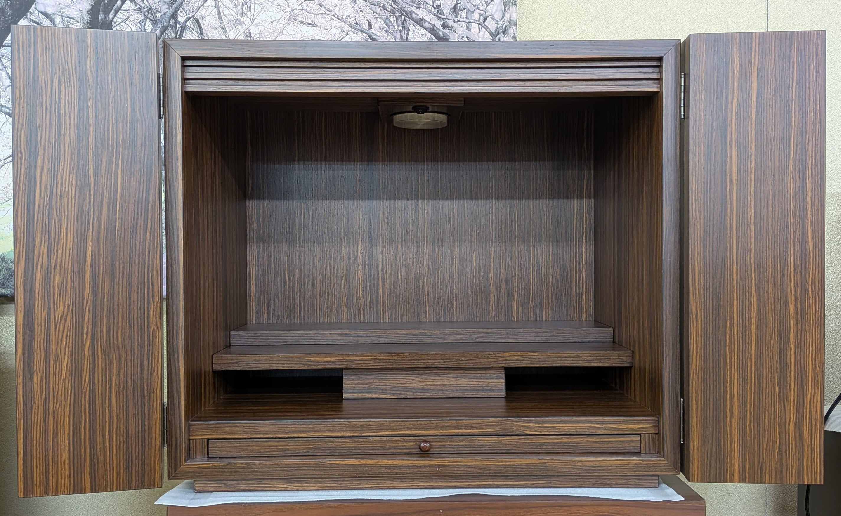 このお仏壇は、ウォールナット調のシンプルな造りが特徴です。洗練された印象を持ちながら、どんなインテリアにも自然に溶け込むため、心和む癒しの空間を演出します。仏壇としての機能性を重視しつつ、温かみのあるデザインが魅力です。