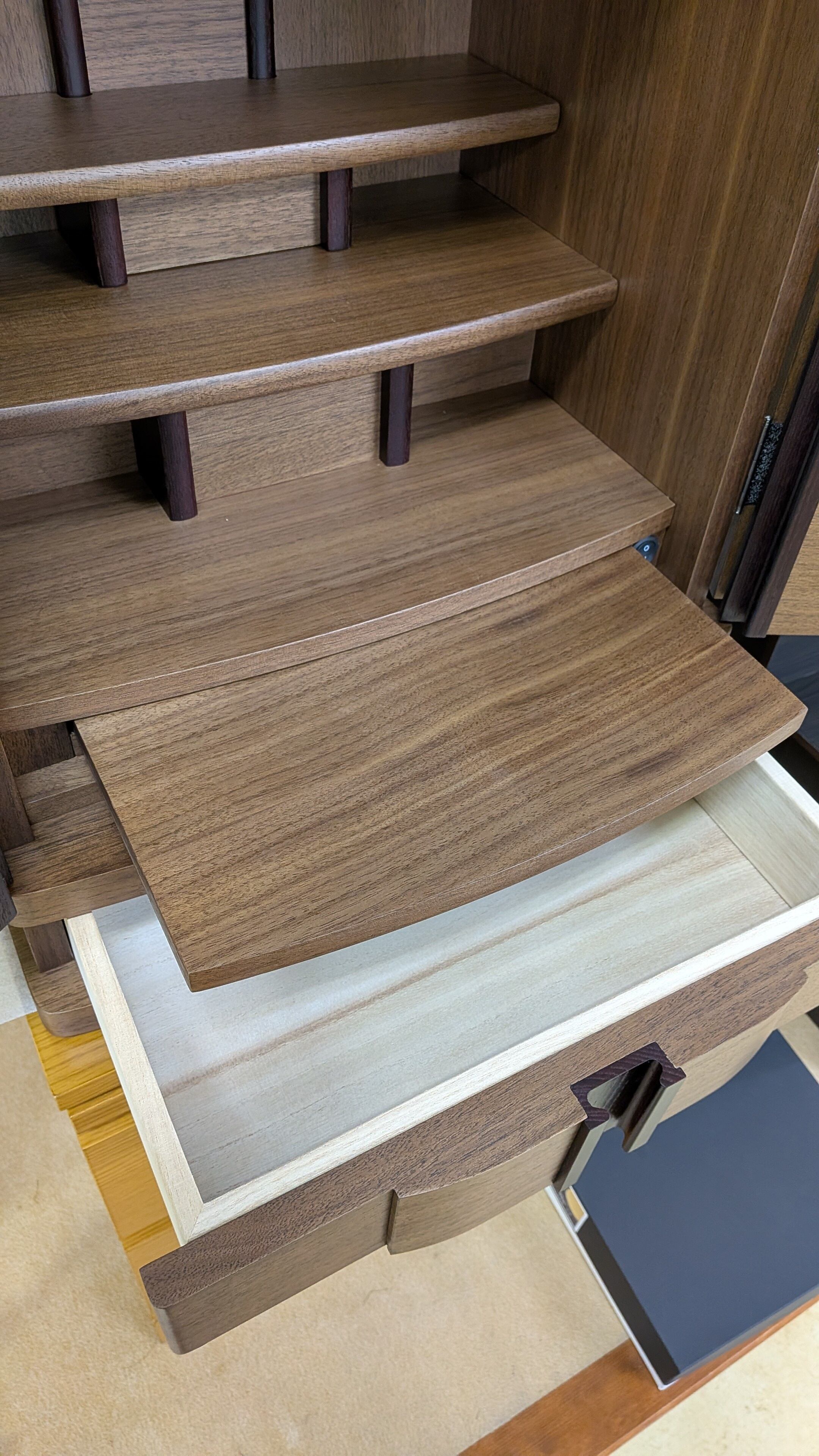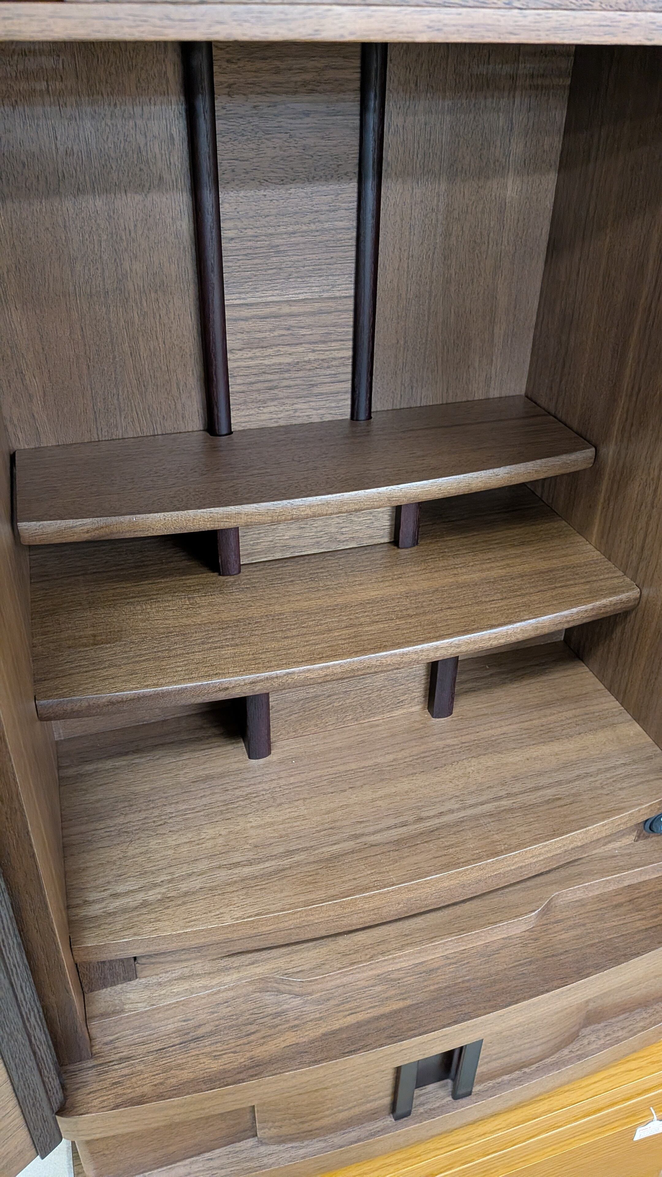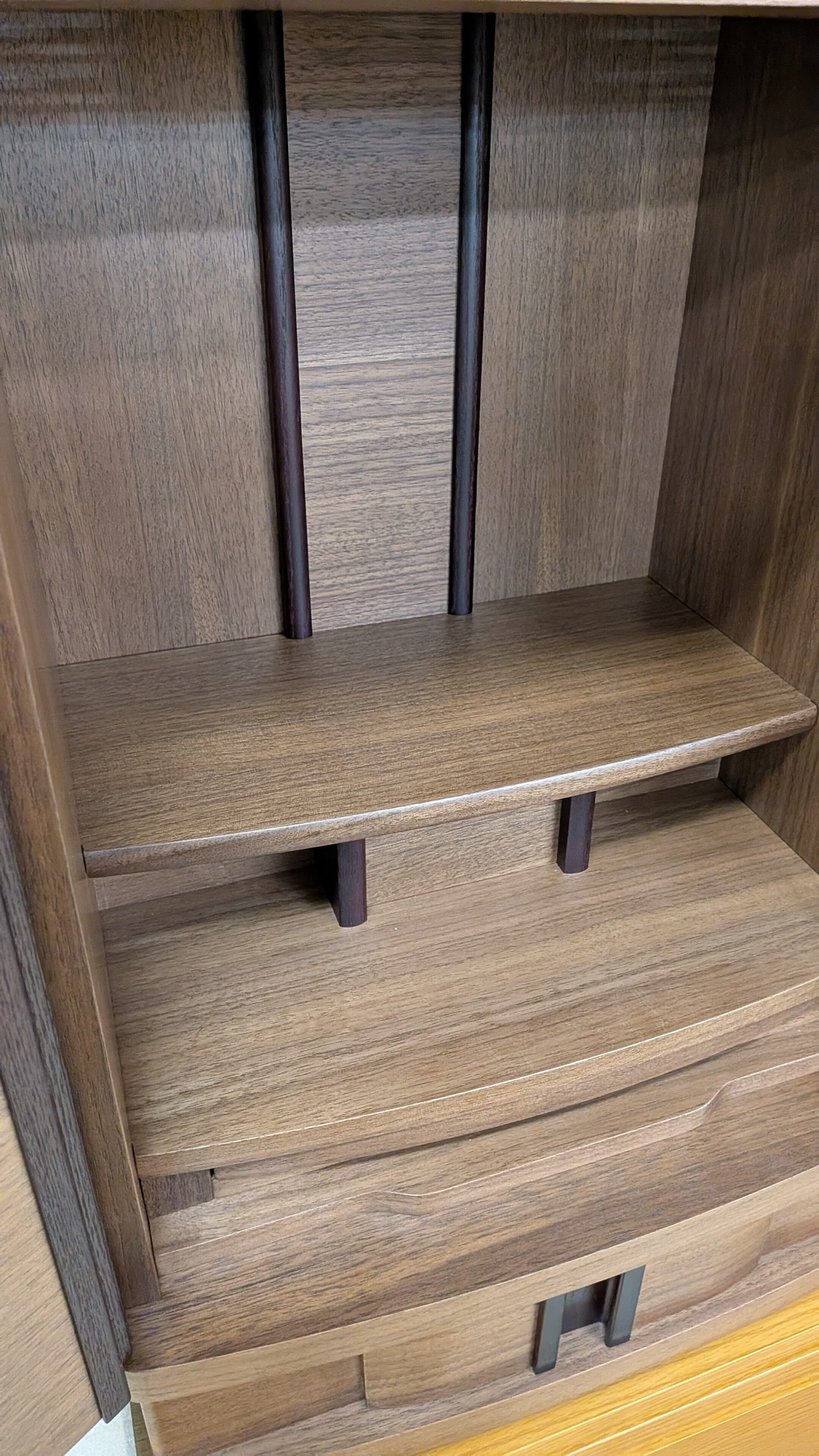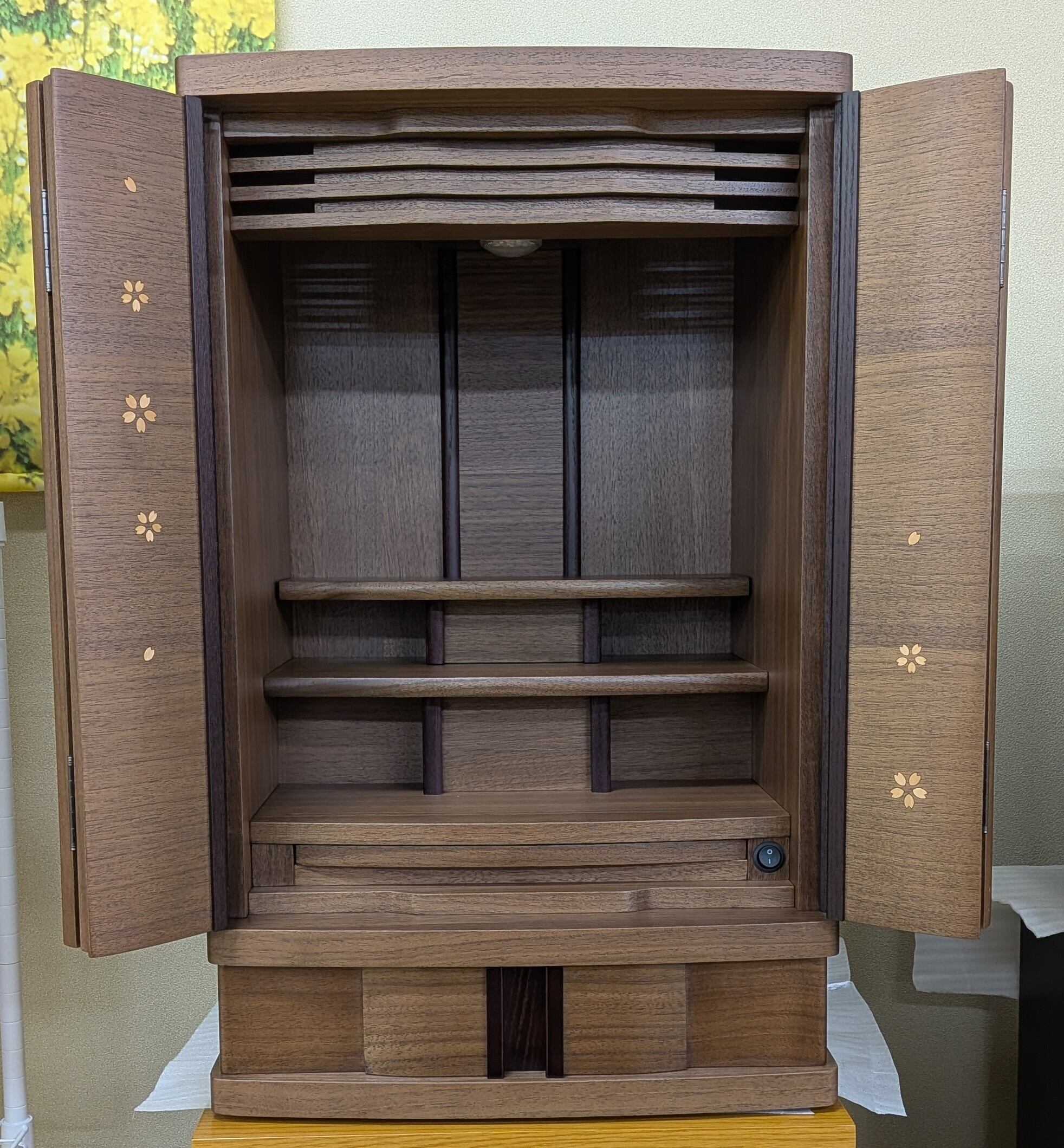 このお仏壇は、繊細な桜の象嵌が特徴で、ウォールナットの深い色合いがその美しさを一層引き立てます。落ち着いた雰囲気と優雅なデザインが調和し、どんなインテリアにもぴったりな存在感を放ちます。お祈りを捧げる特別な場所として、心を和ませる空間を演出します。