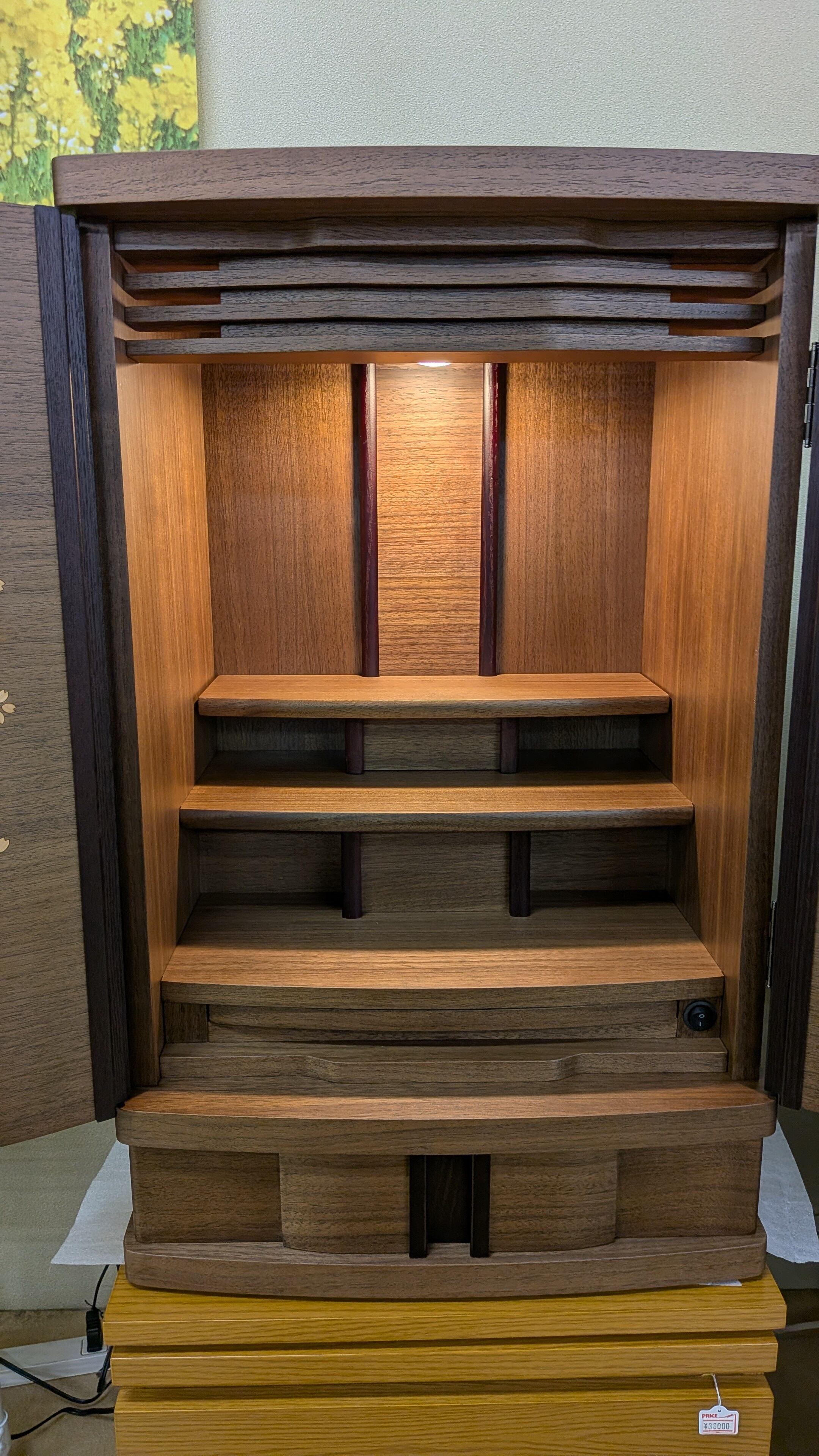 【スペック】高さ:70cm/幅:44cm/奥行:36cm/特徴:桜の象嵌、台は取り外し可能、仏具別