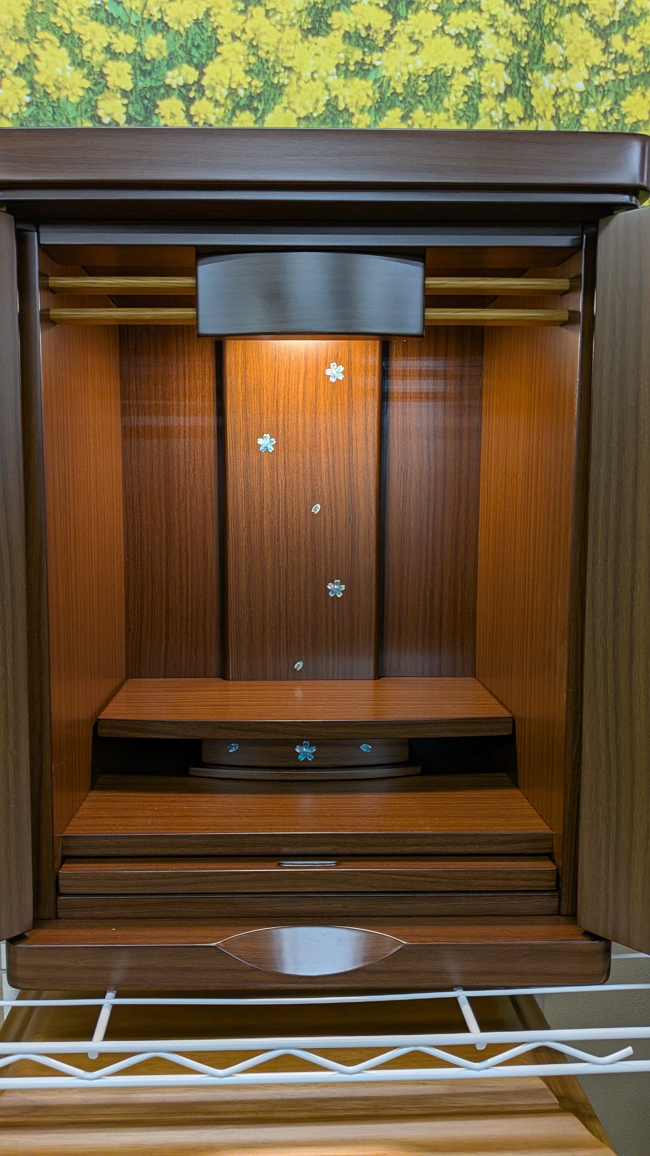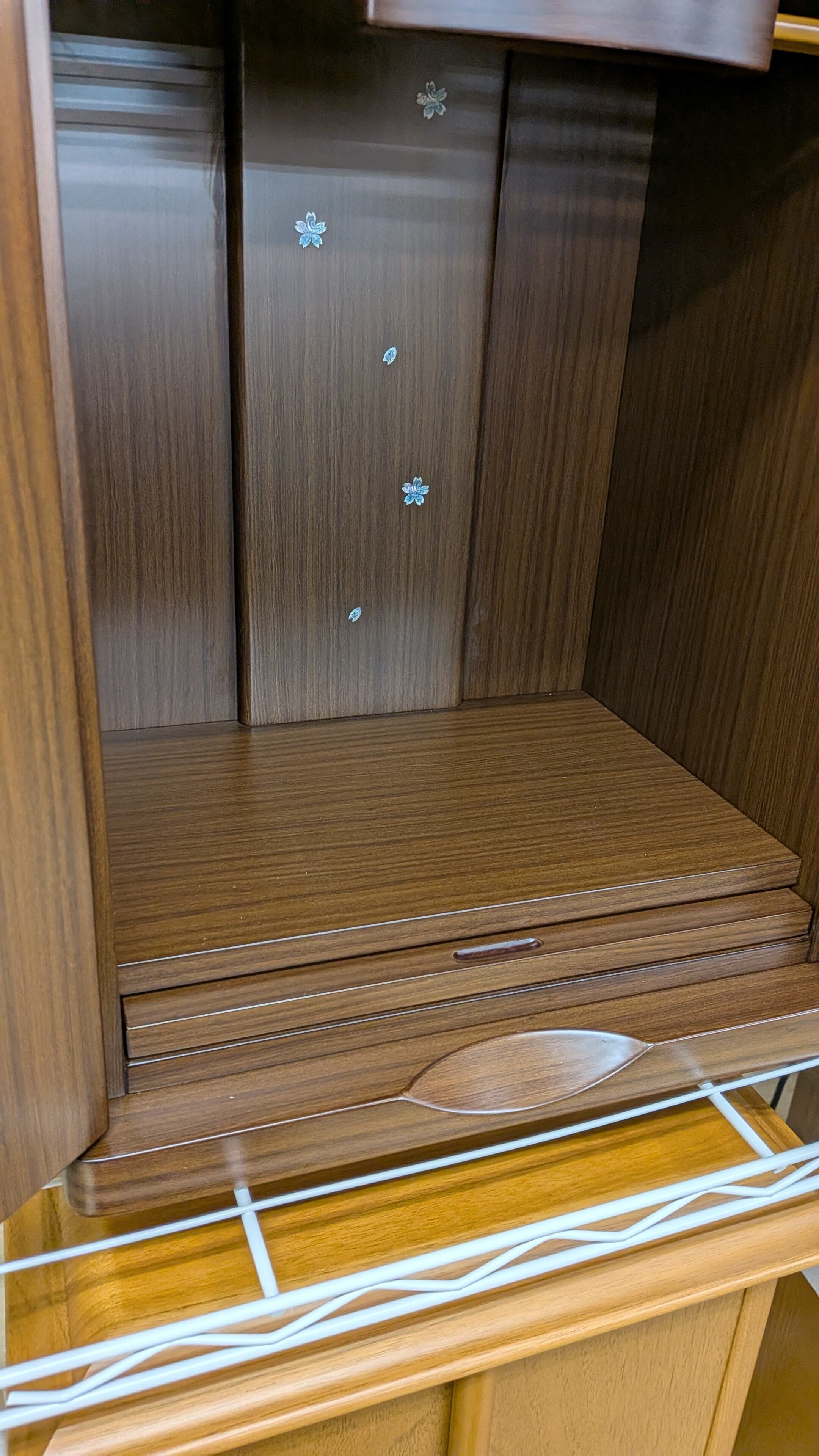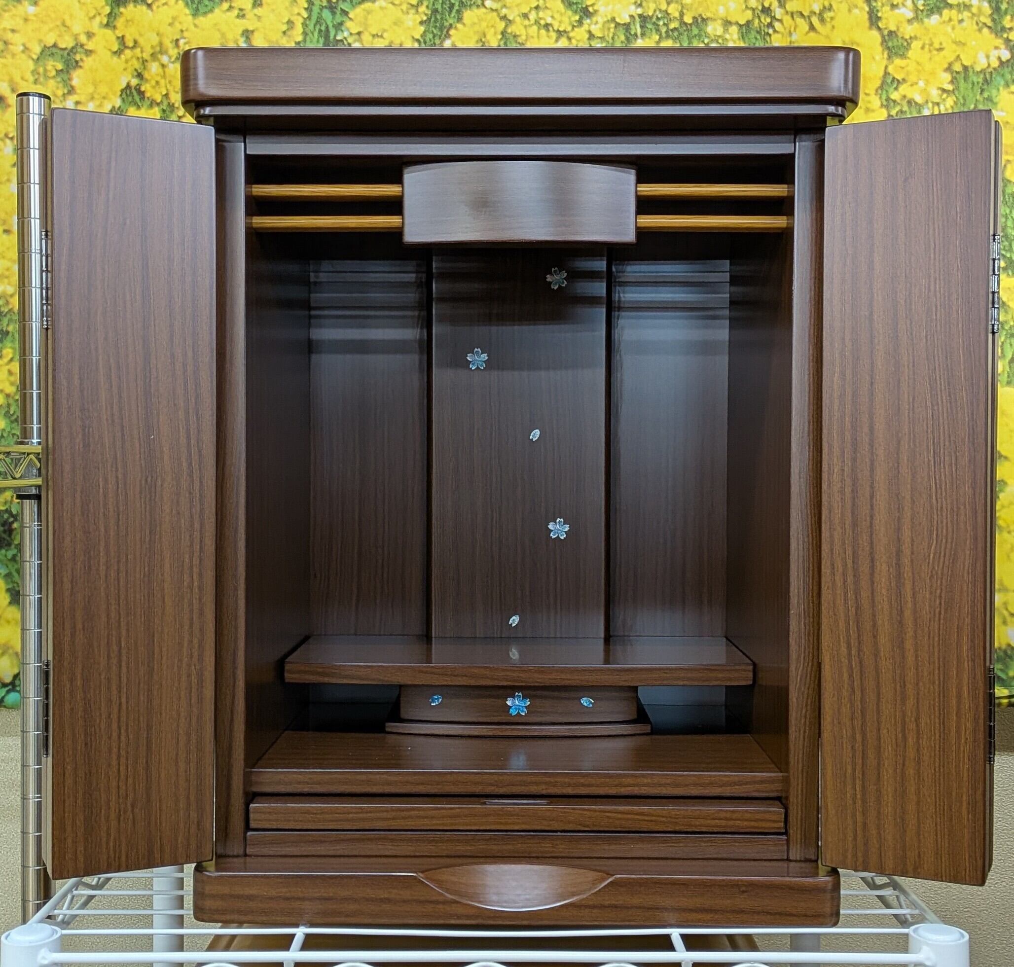 このお仏壇は、繊細に施された桜の螺鈿が特徴で、ウォールナット調の深みのある色合いがその美しさを引き立てます。優雅なデザインと落ち着いた雰囲気が調和し、さまざまなインテリアに溶け込みながら、心を和ませる特別な空間を演出します。