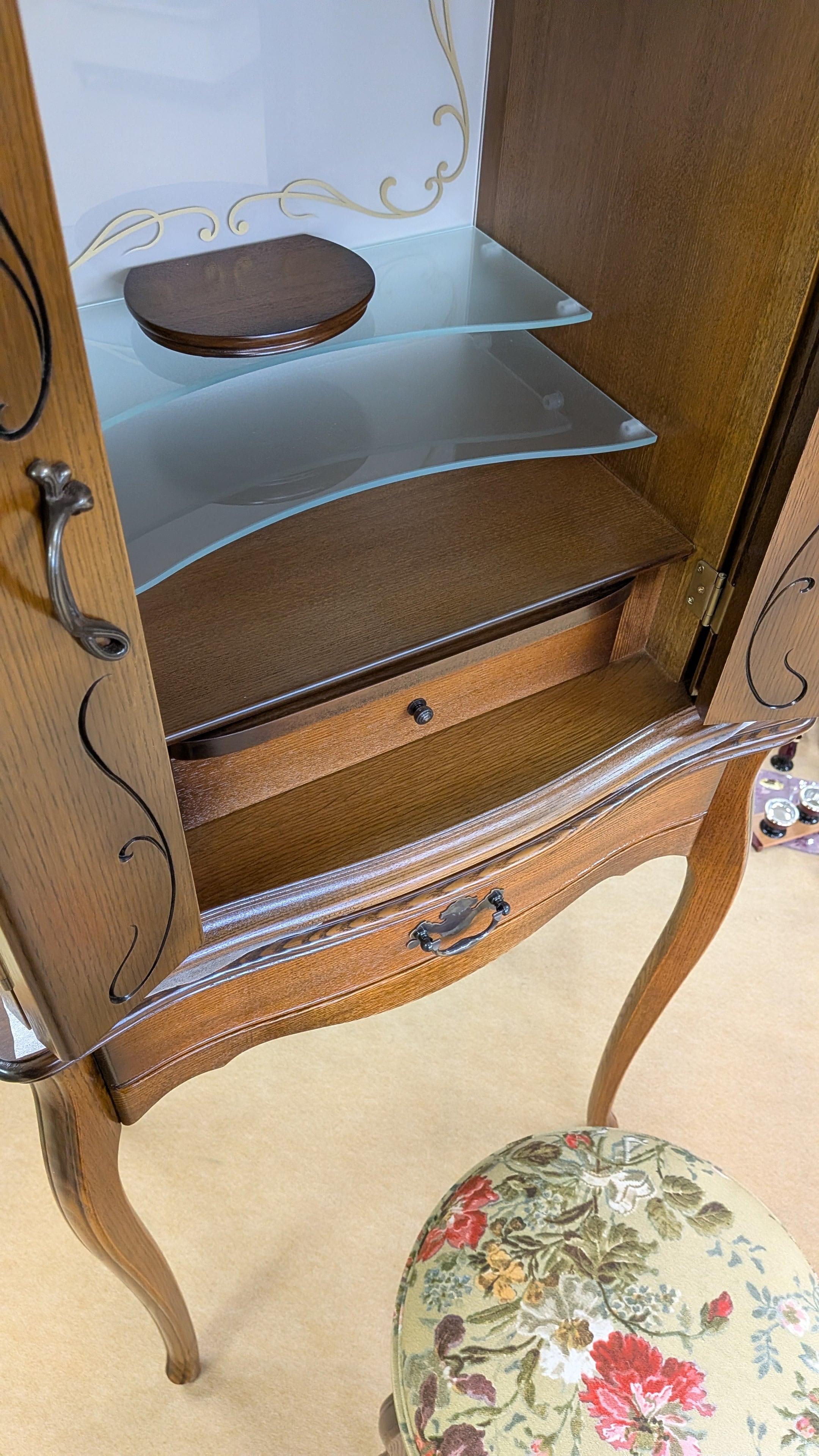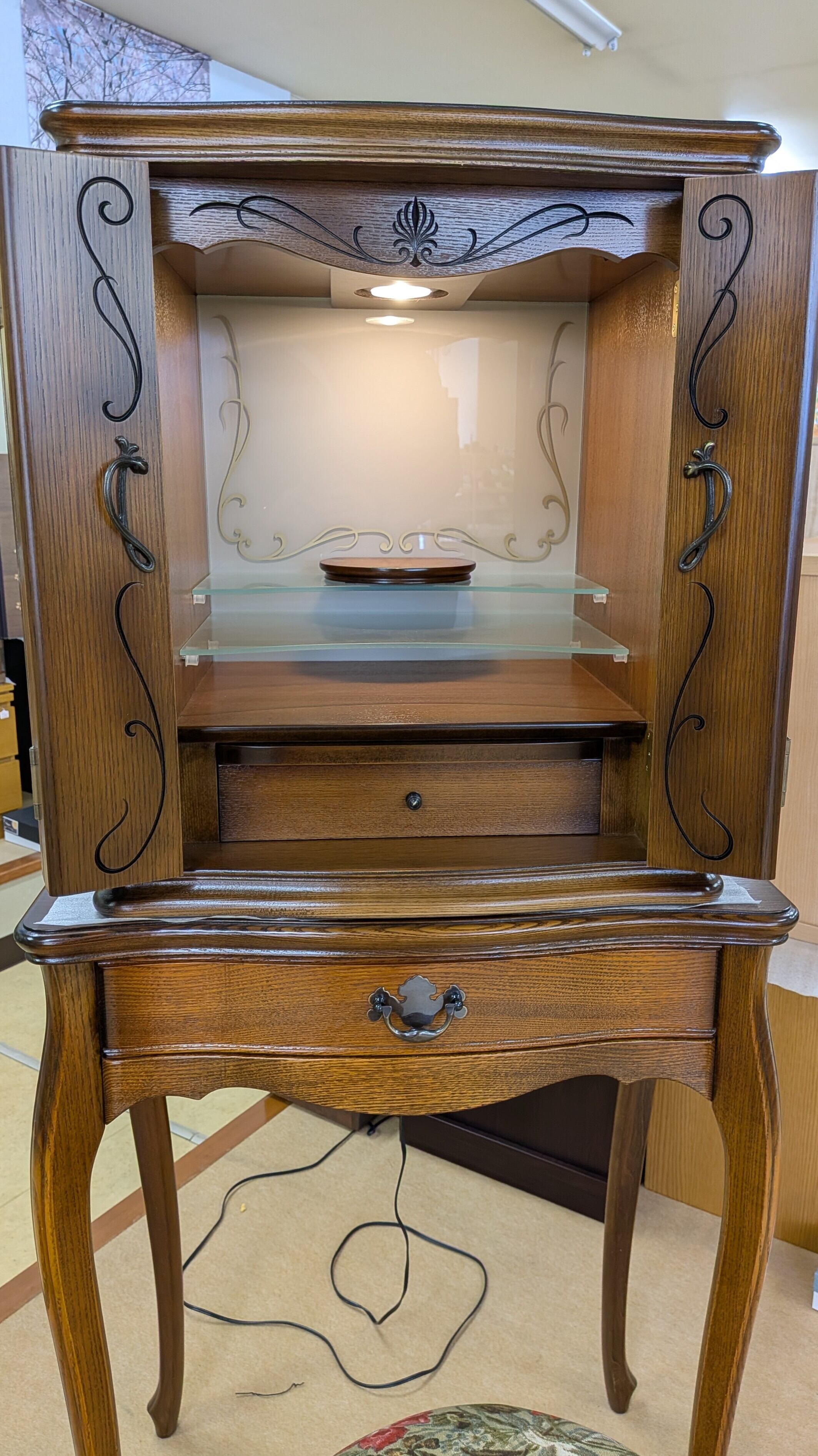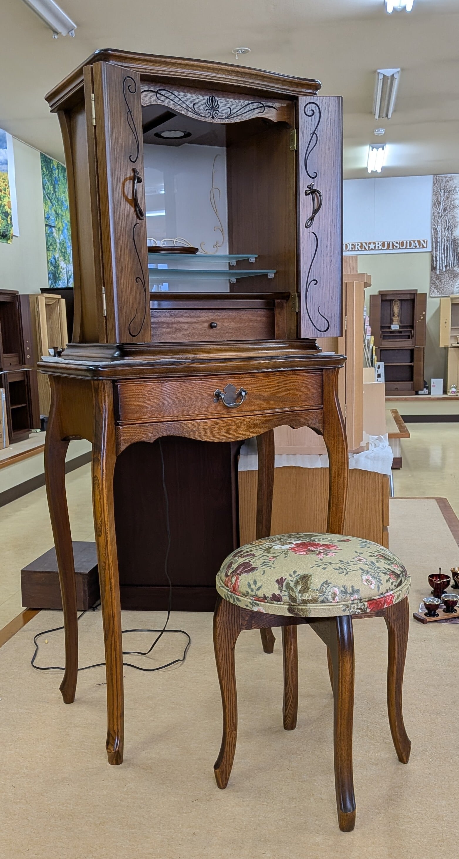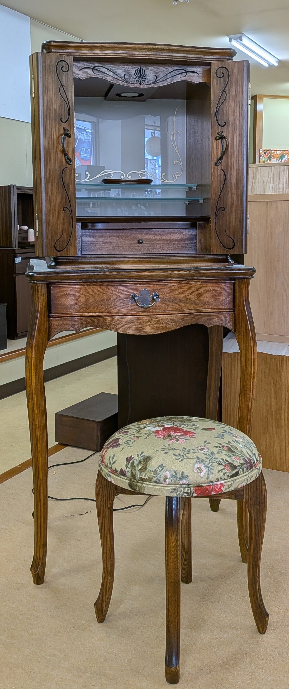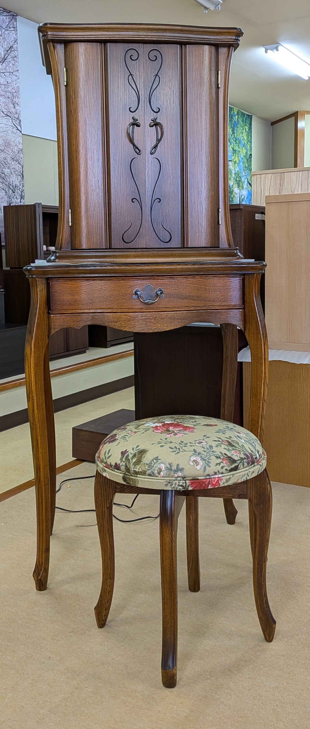 【スペック】高さ:135cm/幅:60cm/奥行:36cm/特徴:アンティーク色、高級仕上げ、台と椅子付き