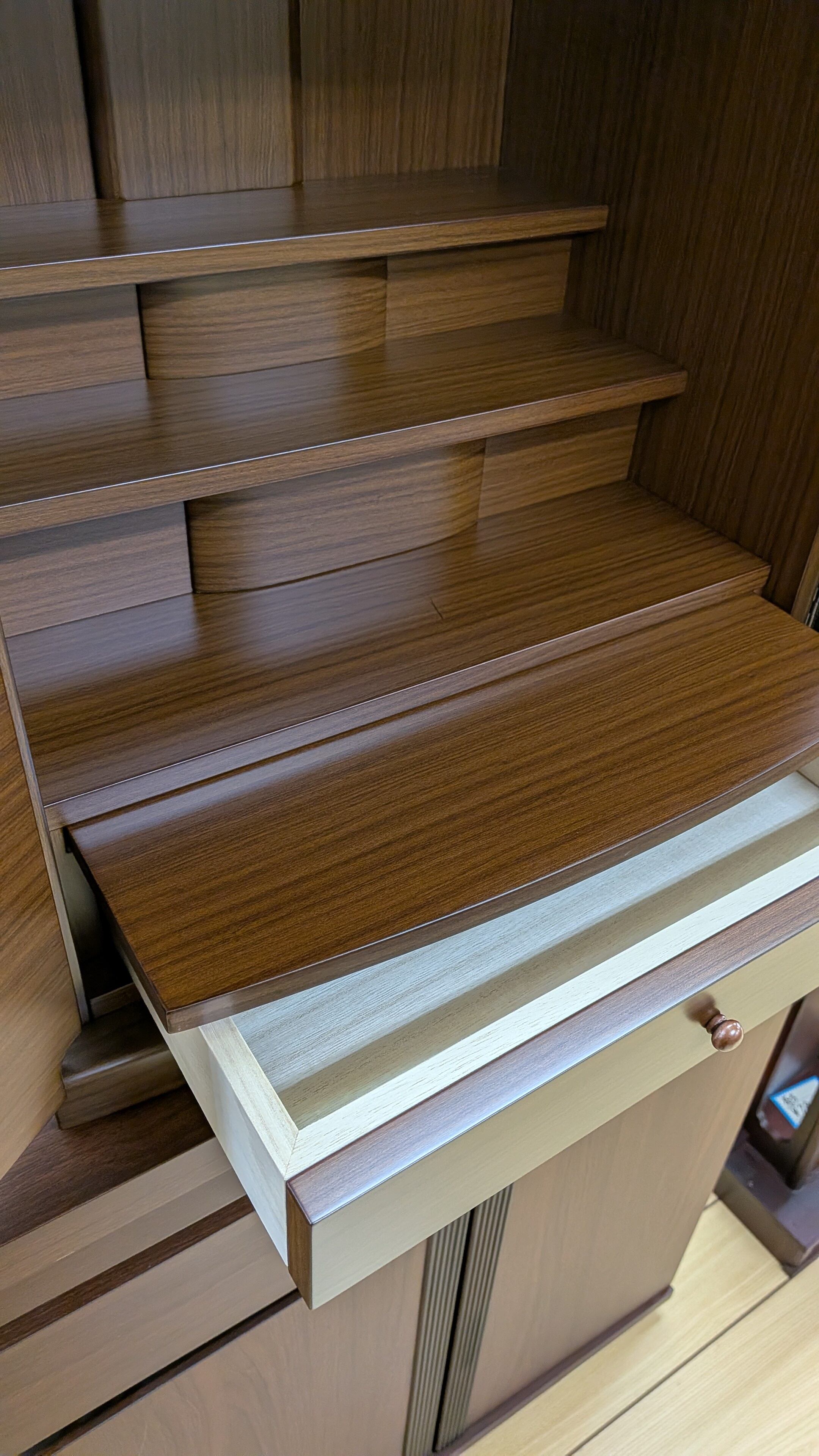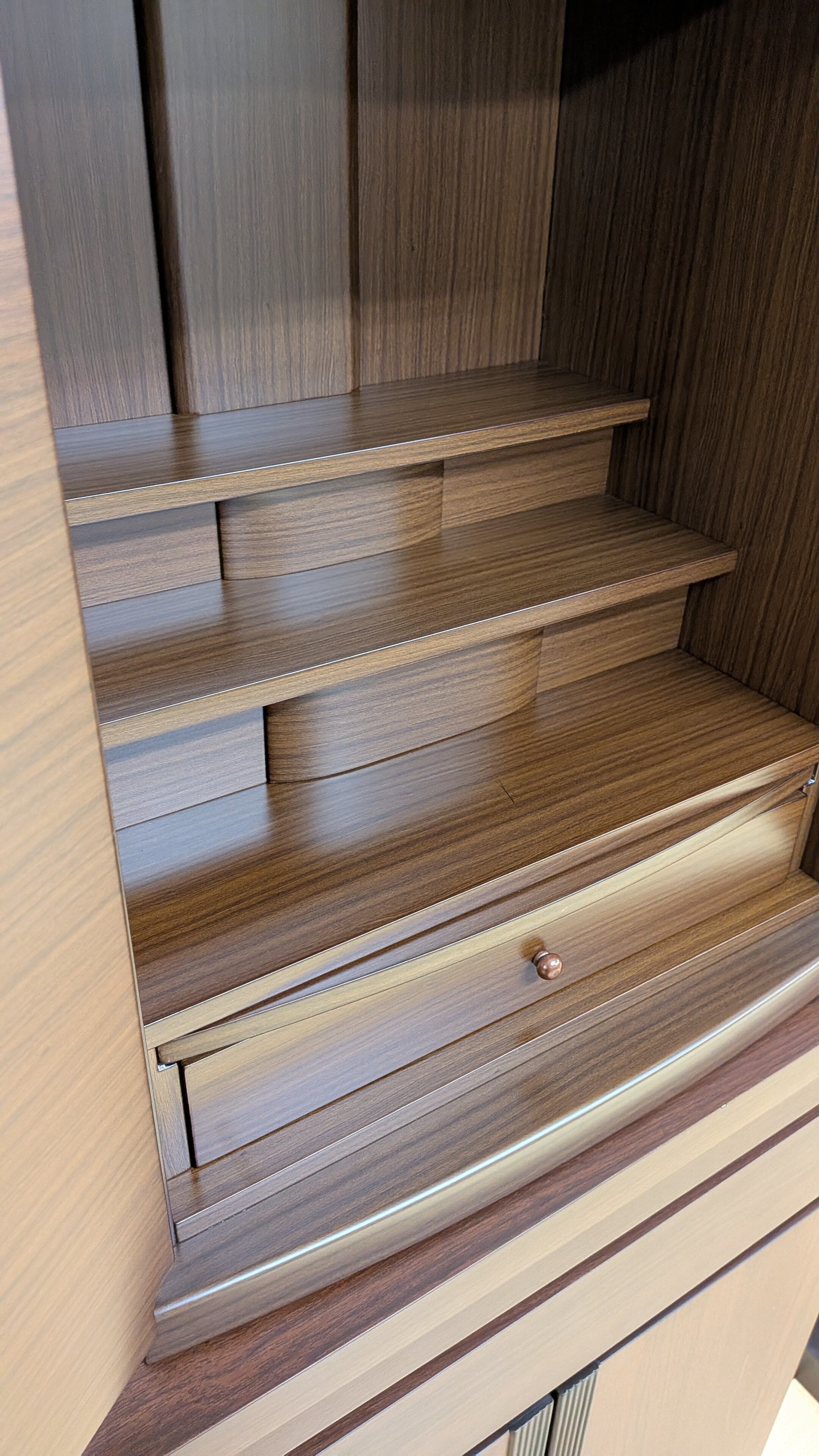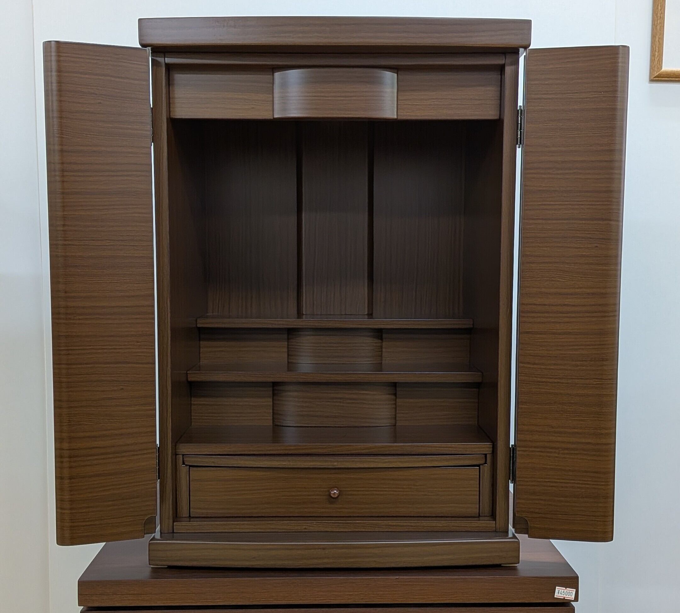 このお仏壇は、ウォールナット調の美しい木目が特徴で、落ち着いた雰囲気を醸し出します。優雅さとシンプルさを兼ね備えたデザインで、どんなインテリアにも自然に調和し、家庭の大切な空間を一層引き立てます。お祈りのひとときがさらに特別なものになることでしょう。