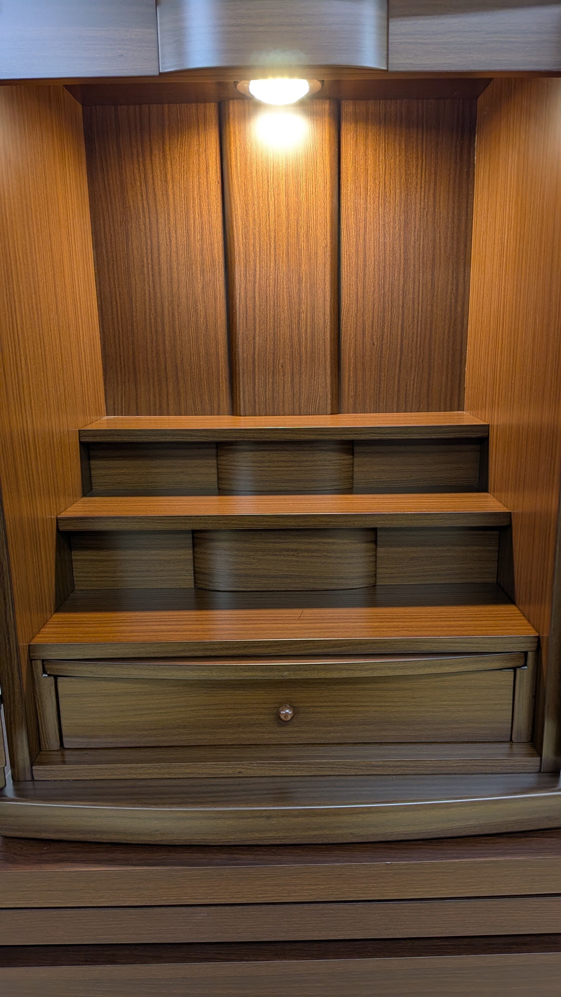 【スペック】高さ:60cm/幅:42cm/奥行:32cm/特徴:ウォールナット調の木目、LEDライト付、仏具別