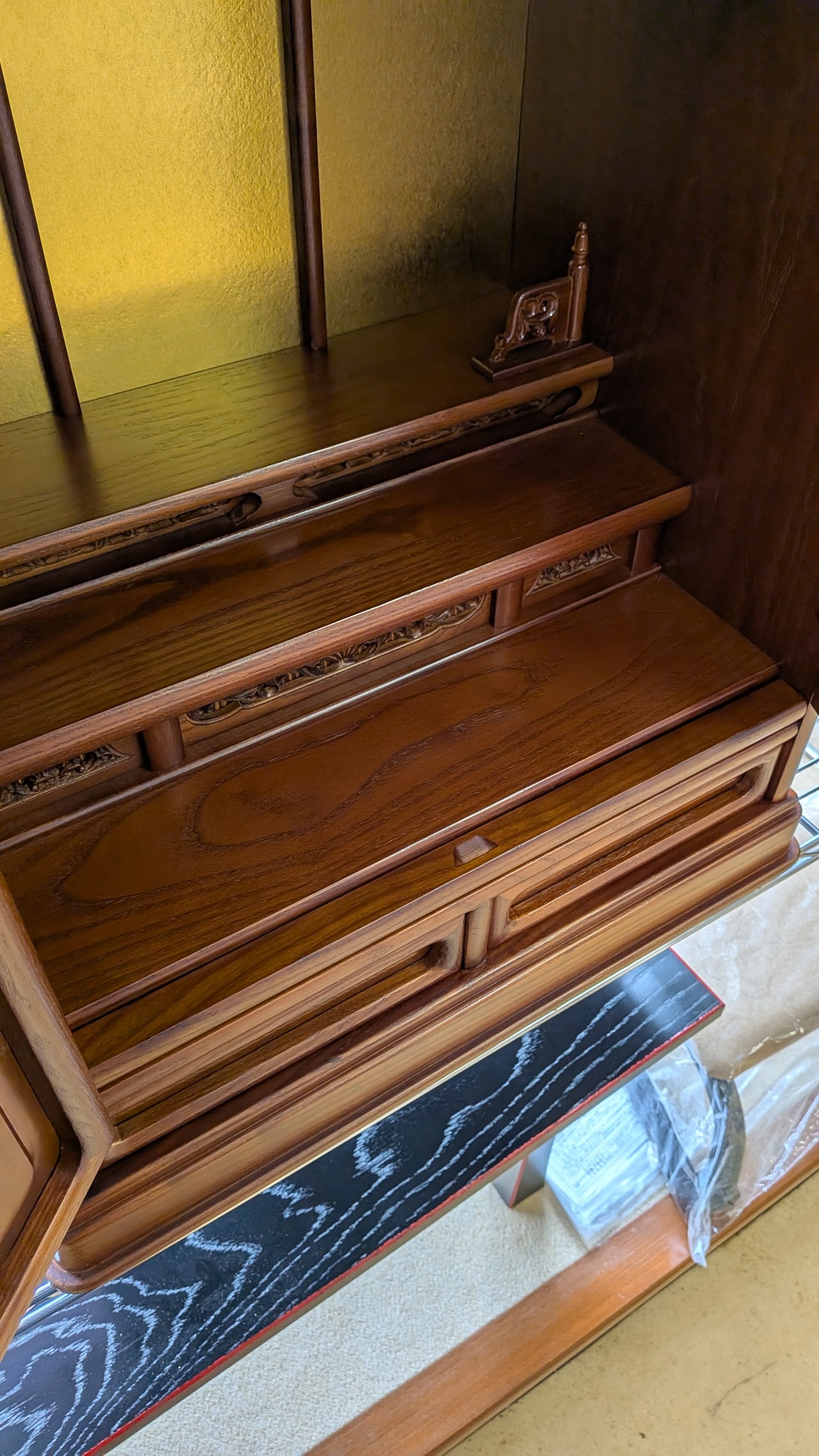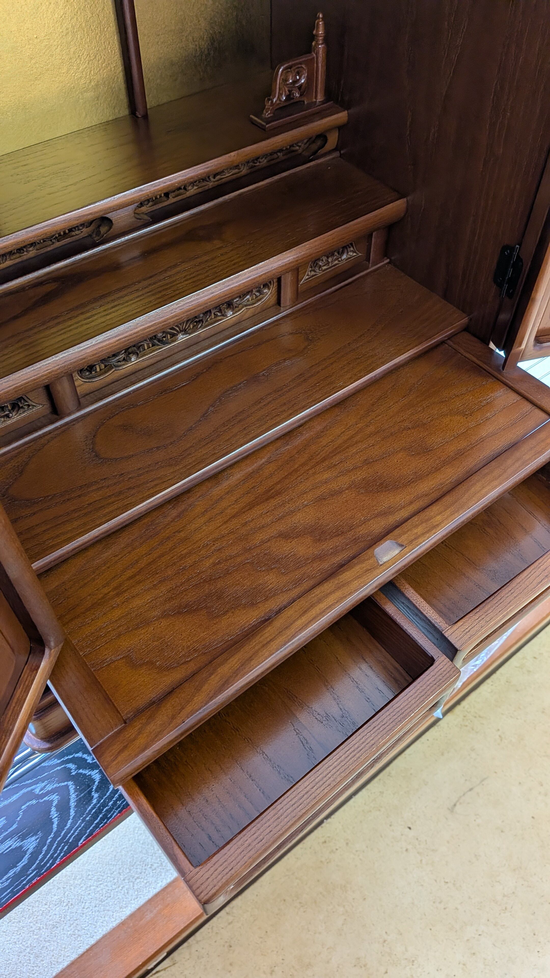 【スペック】高さ:72cm/幅:54cm/奥行:35cm/特徴:ケヤキ色、仏具別