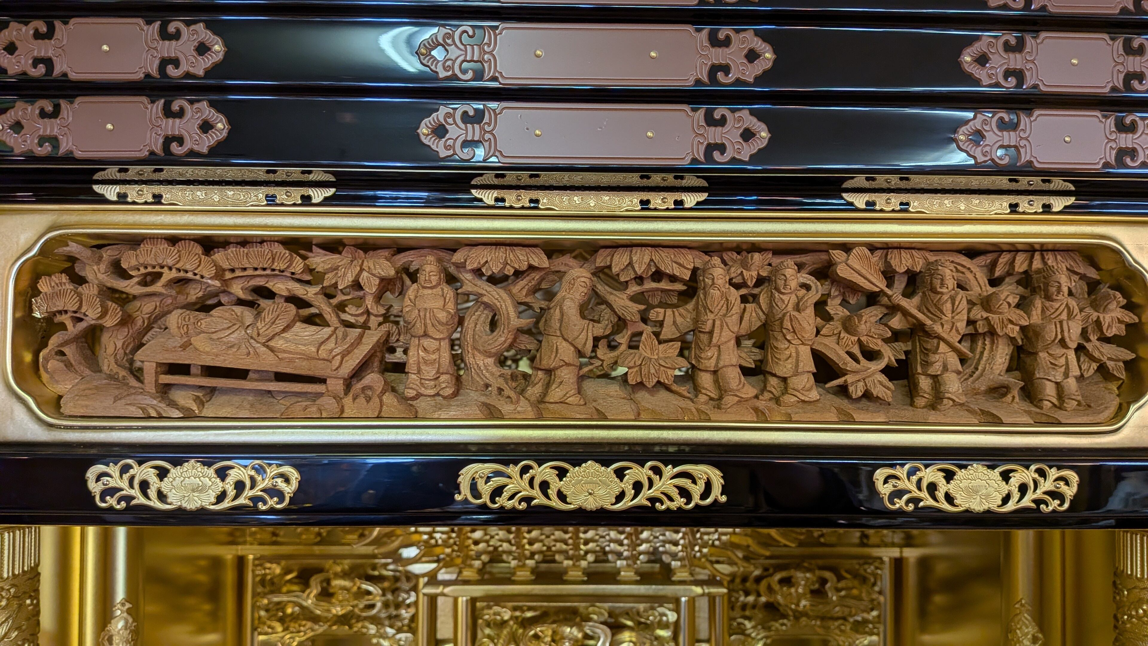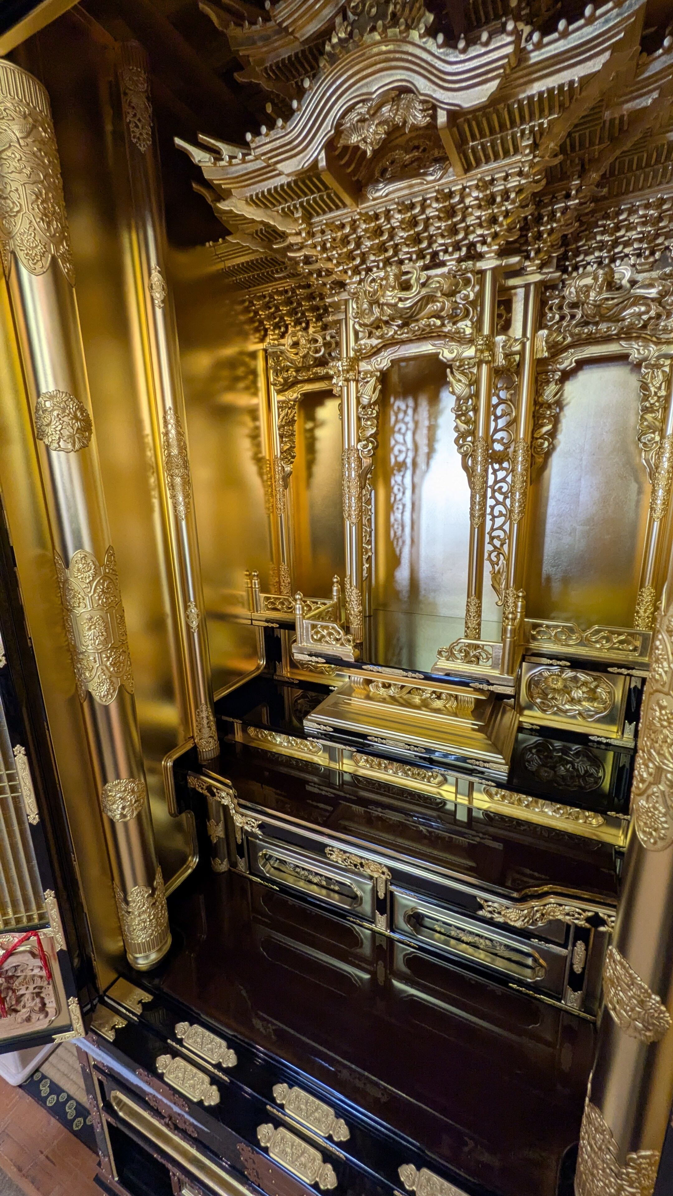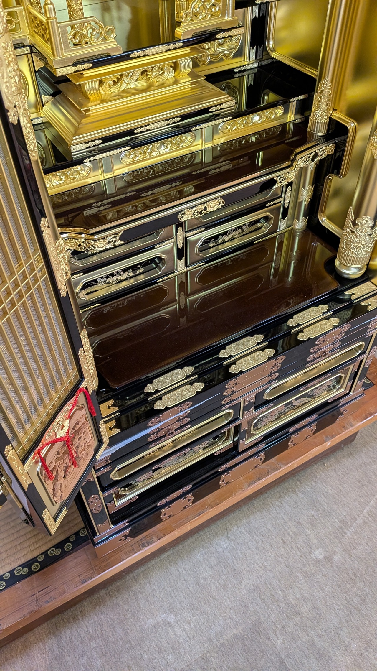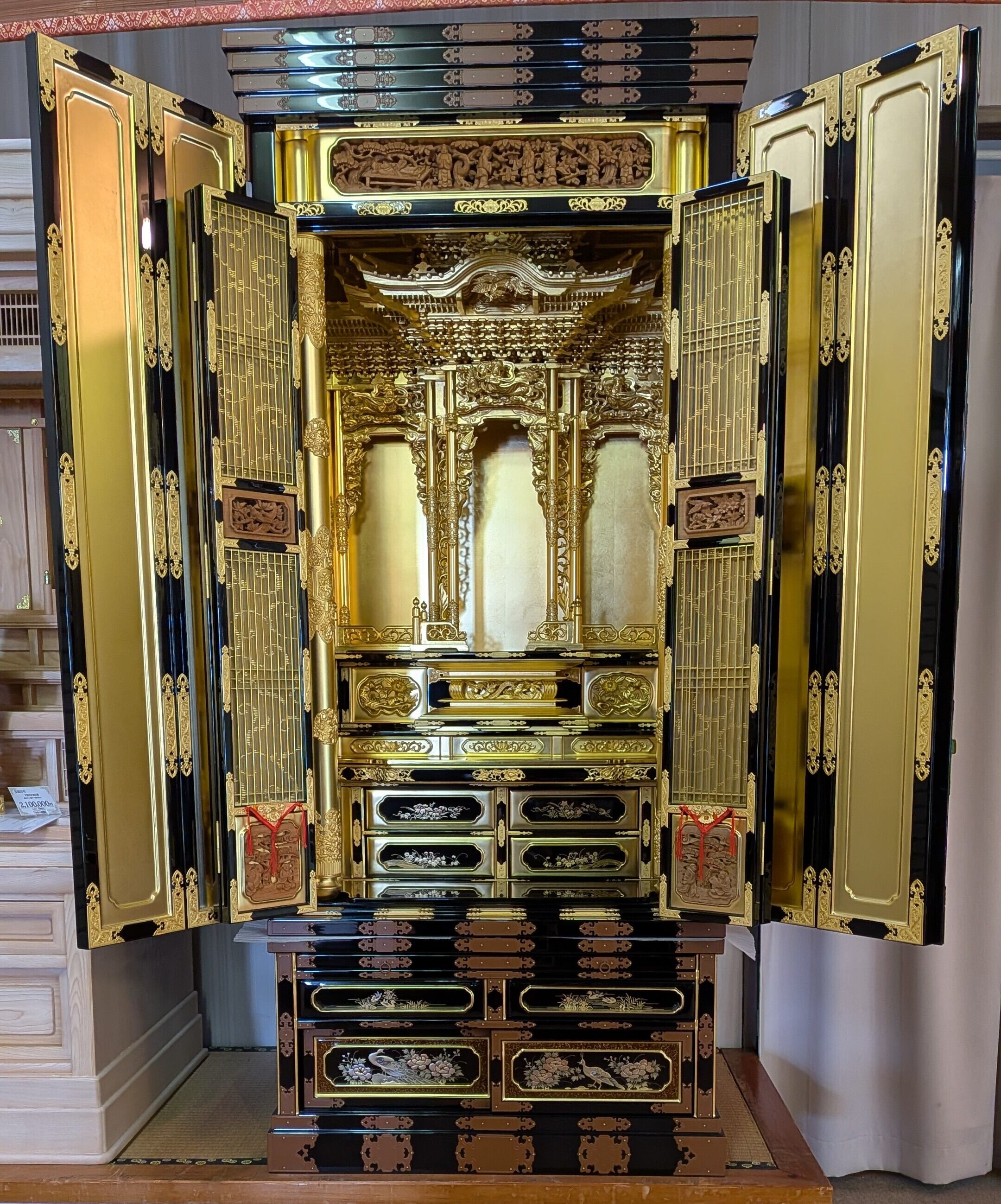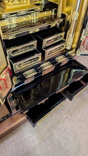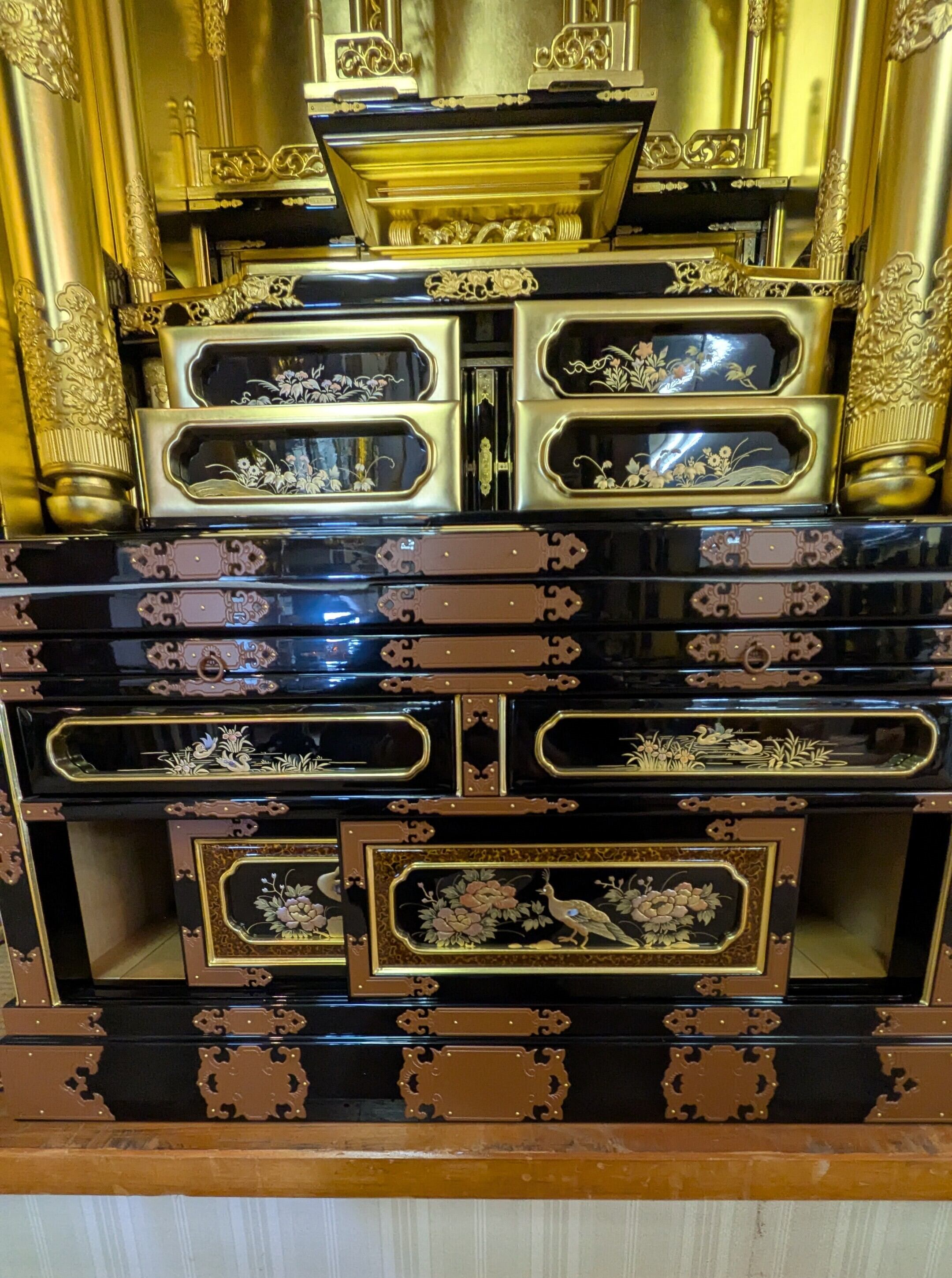 【スペック】高さ:171cm/幅:77cm/奥行:65cm/特徴:本金の大型仏壇、仏具付き