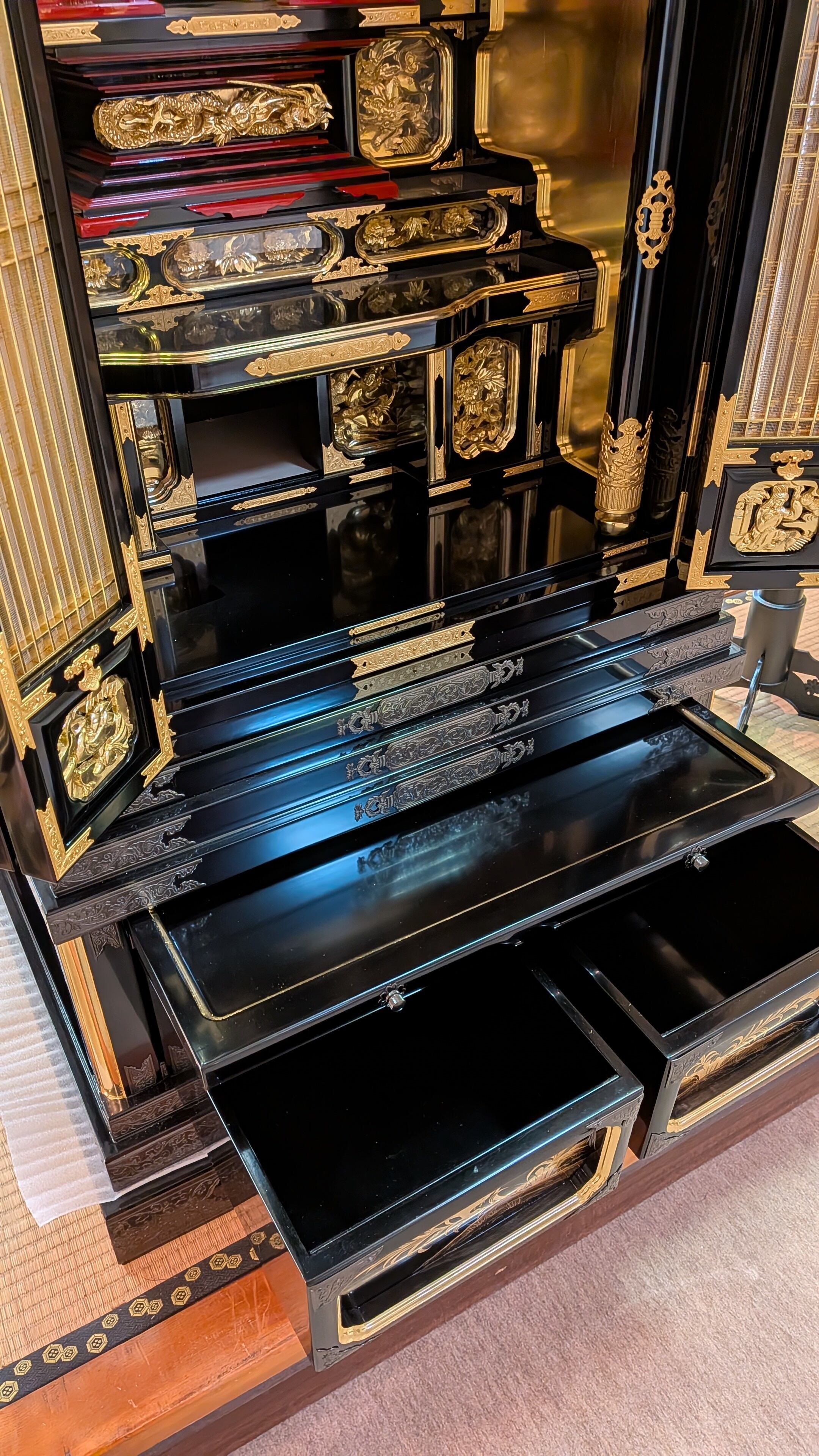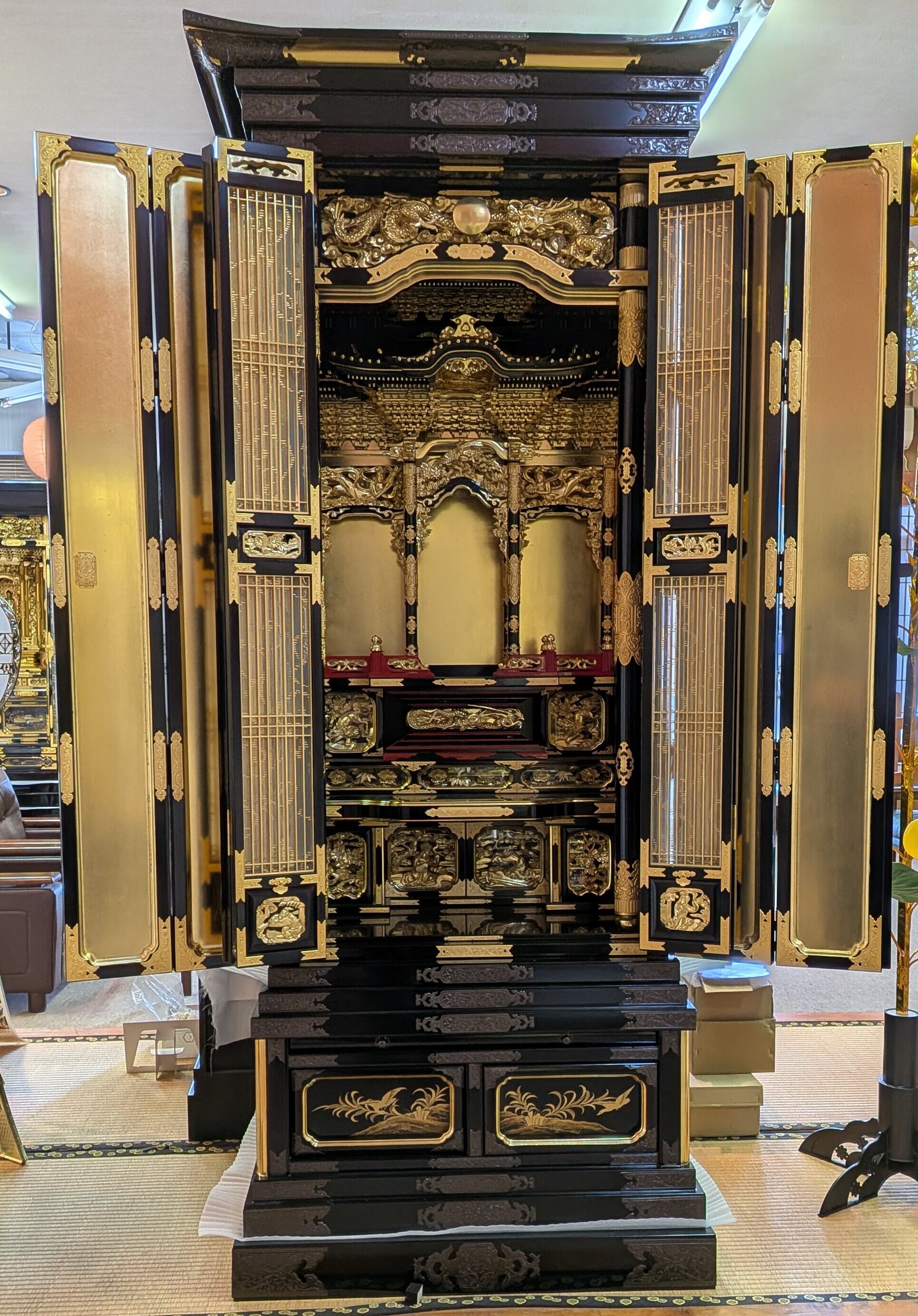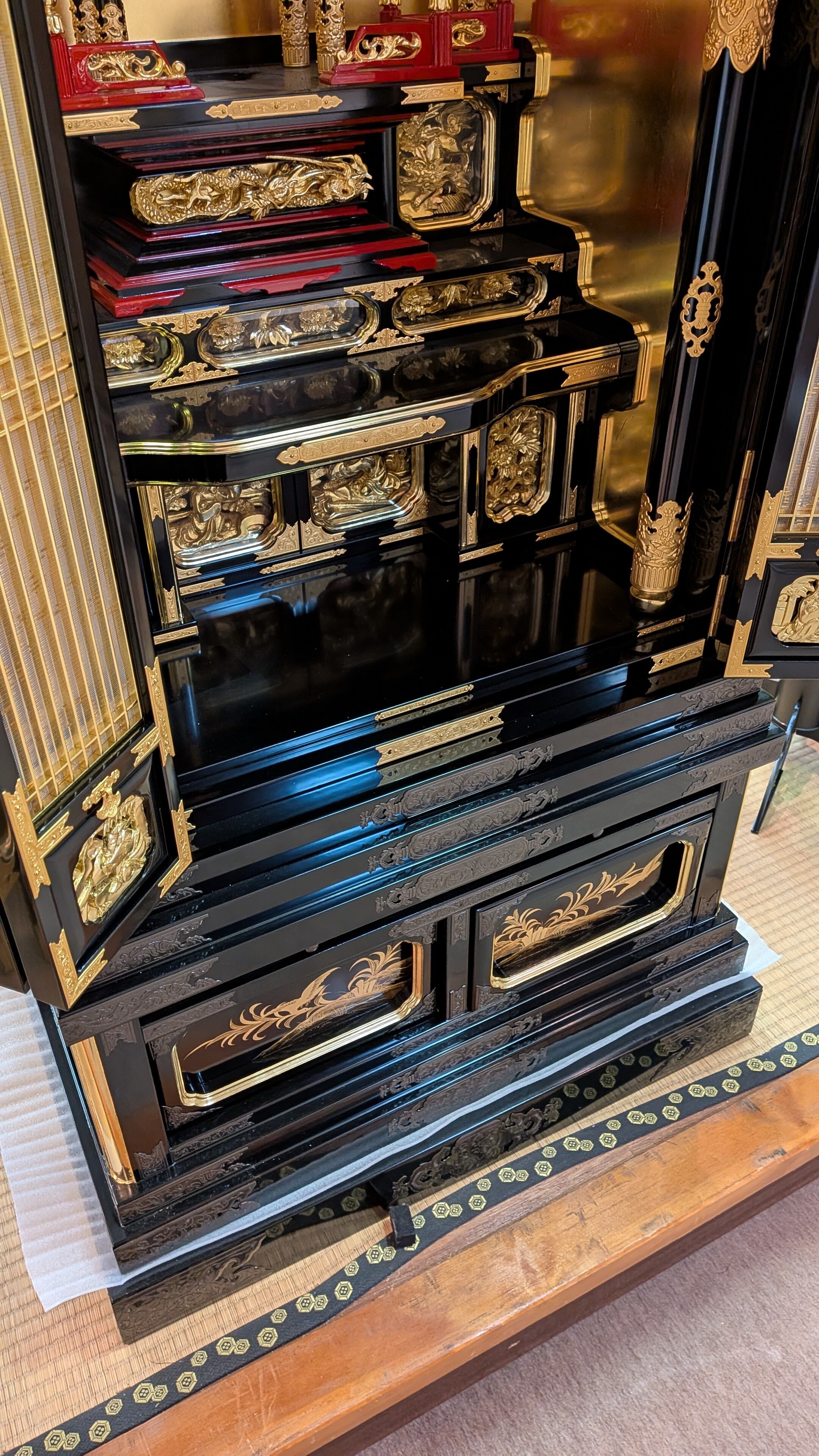 【スペック】高さ:177cm/幅:74cm/奥行:61cm/特徴:当店製造の黒仕上げ金仏壇、仏具付き