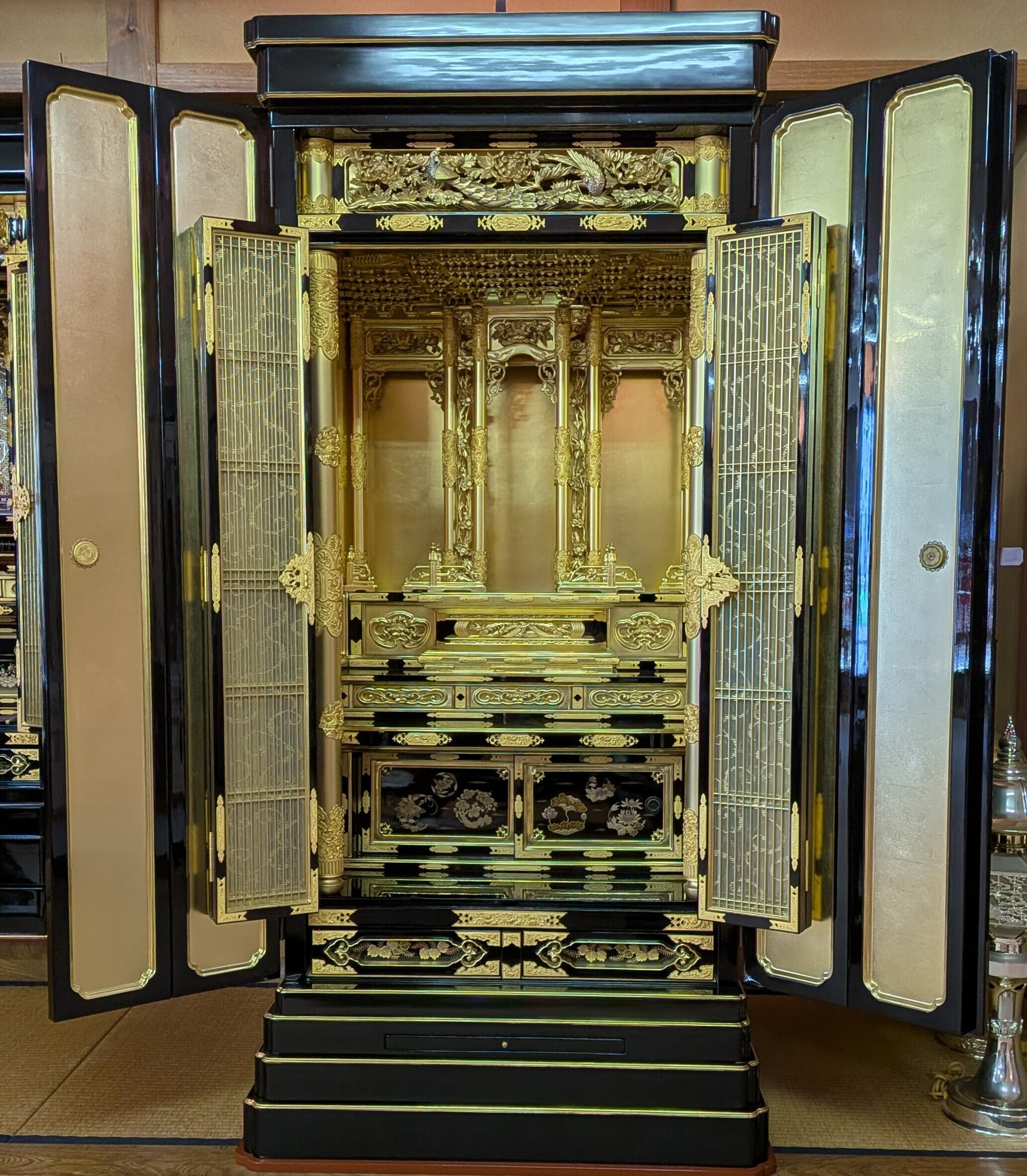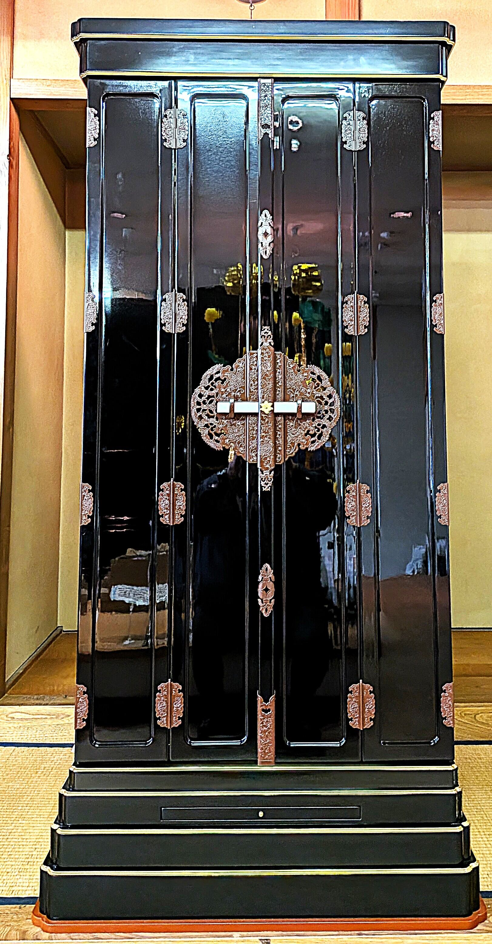 【スペック】高さ:175cm/幅:85cm/奥行:72cm/特徴:大型の本金仏壇、仏具付き