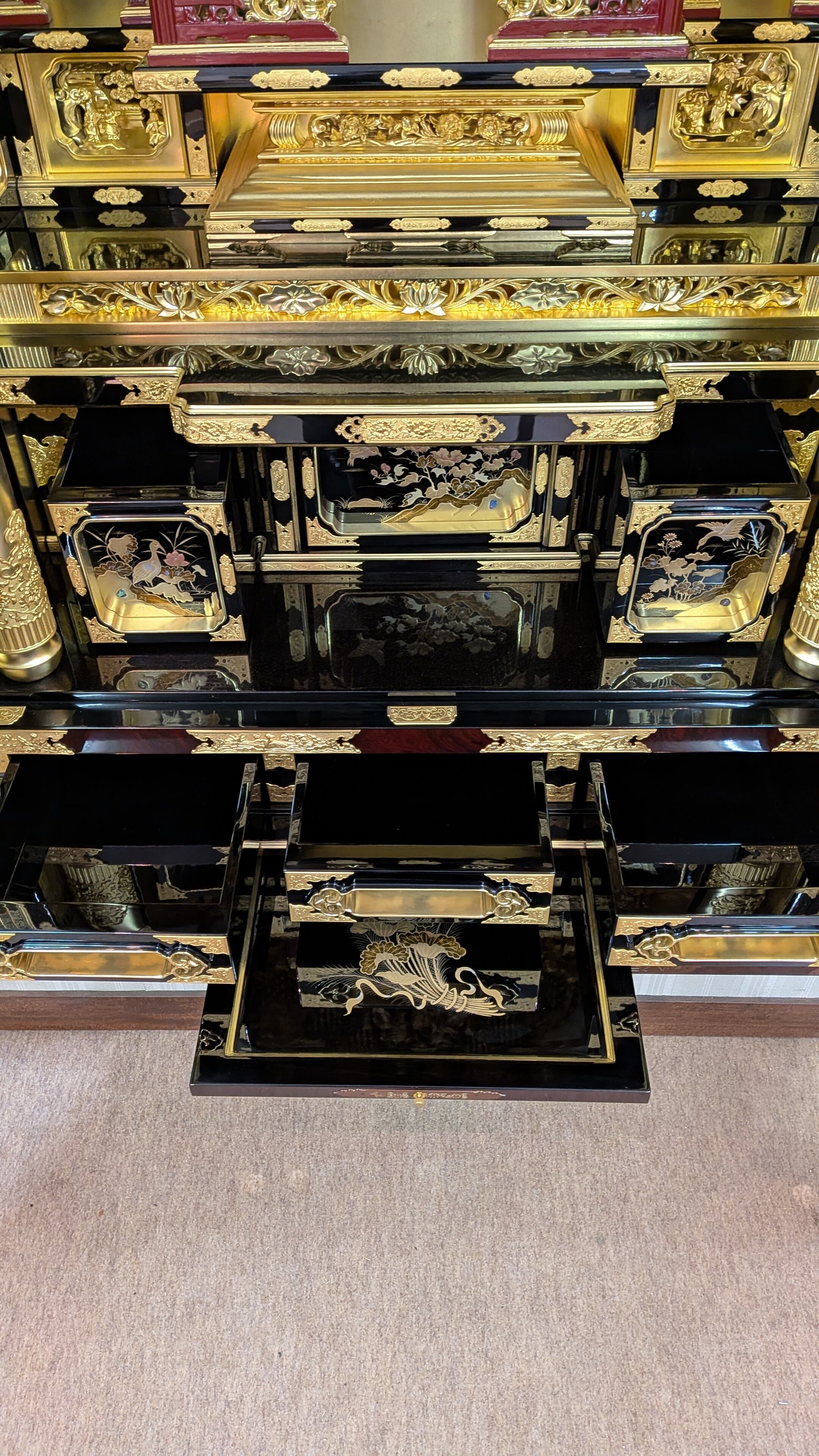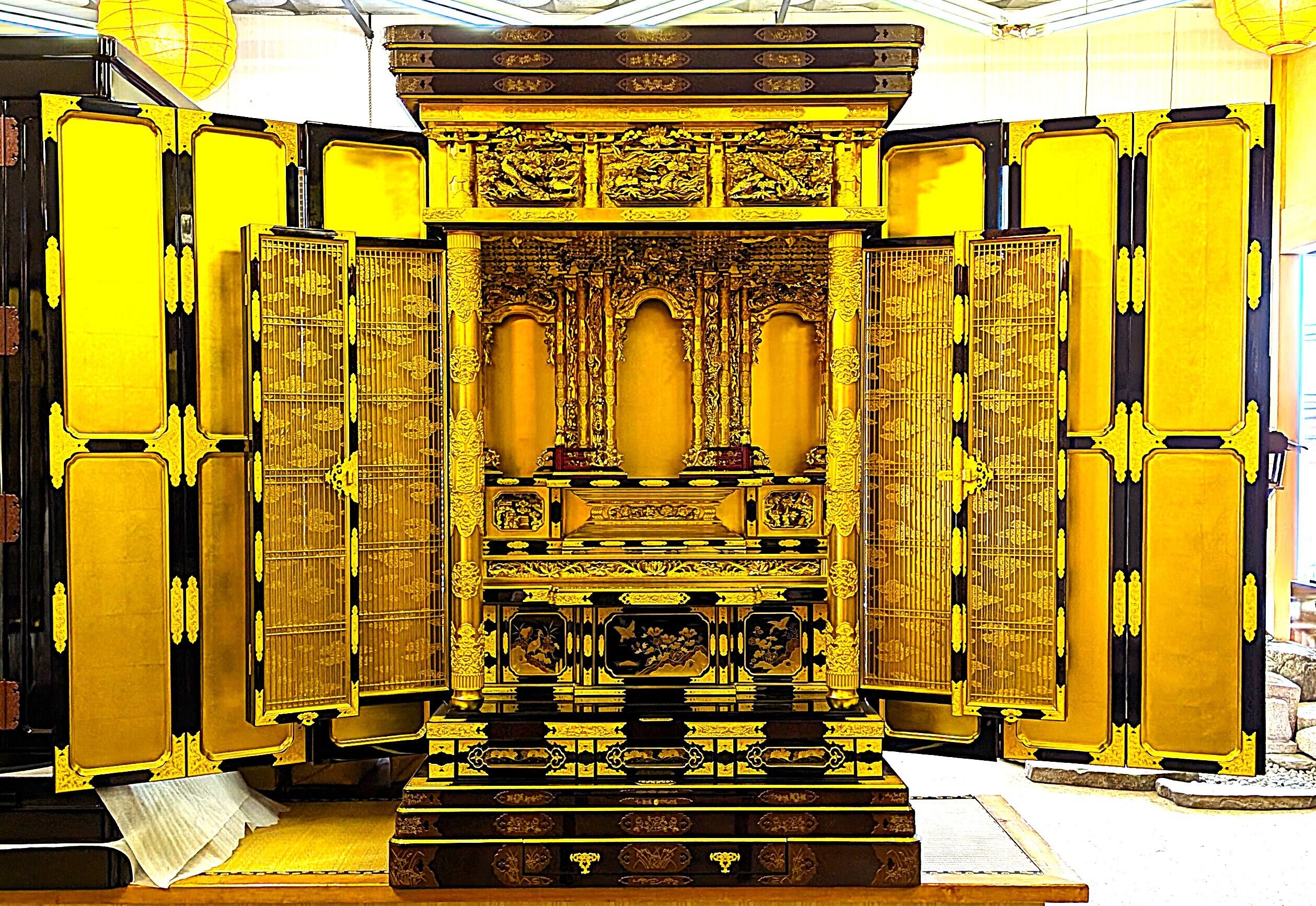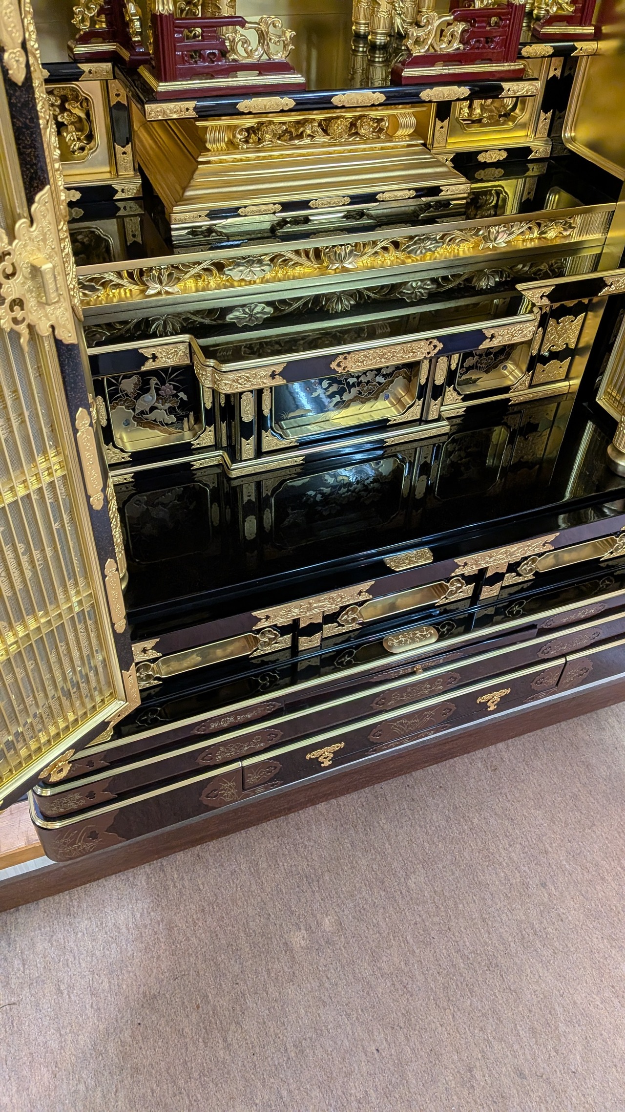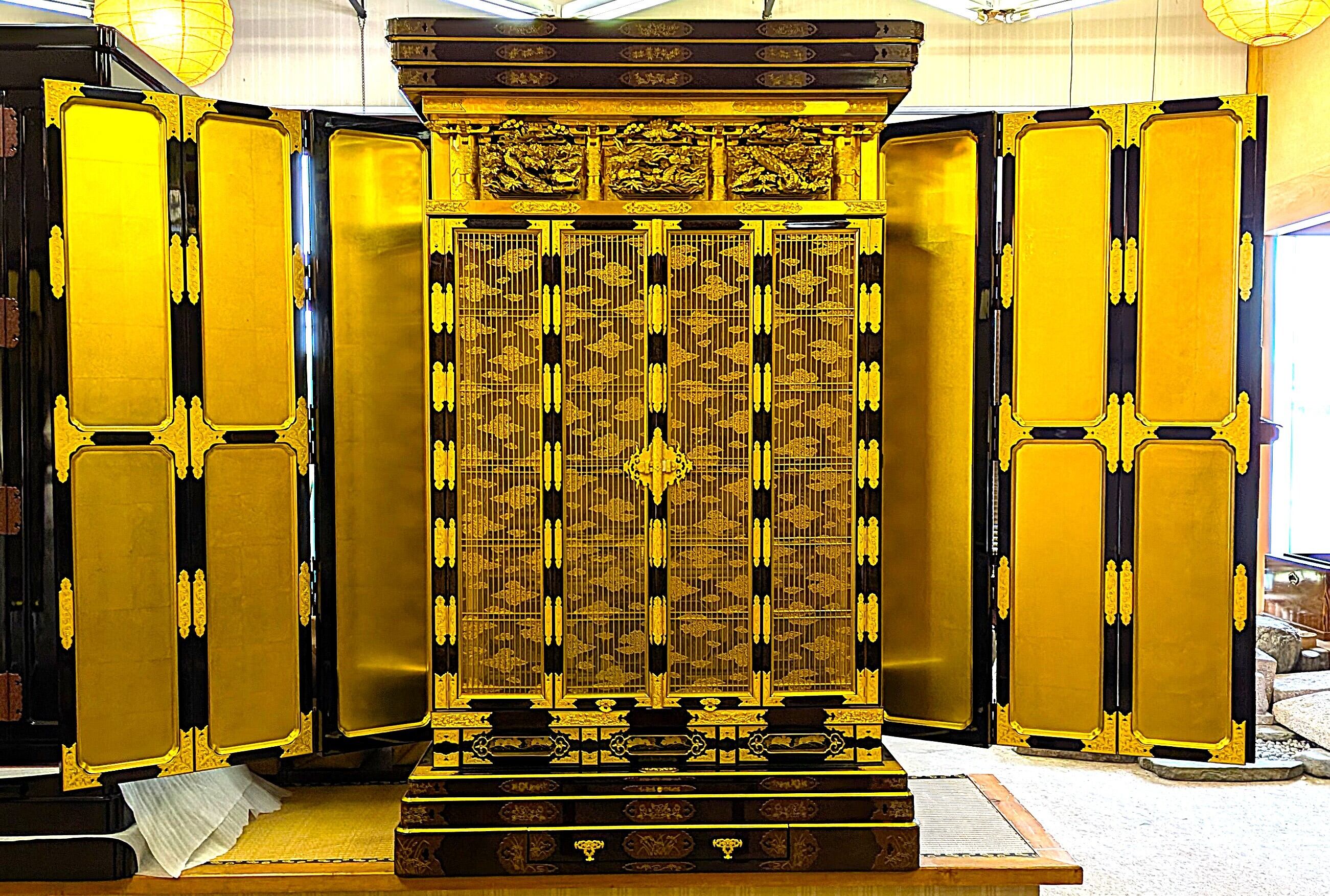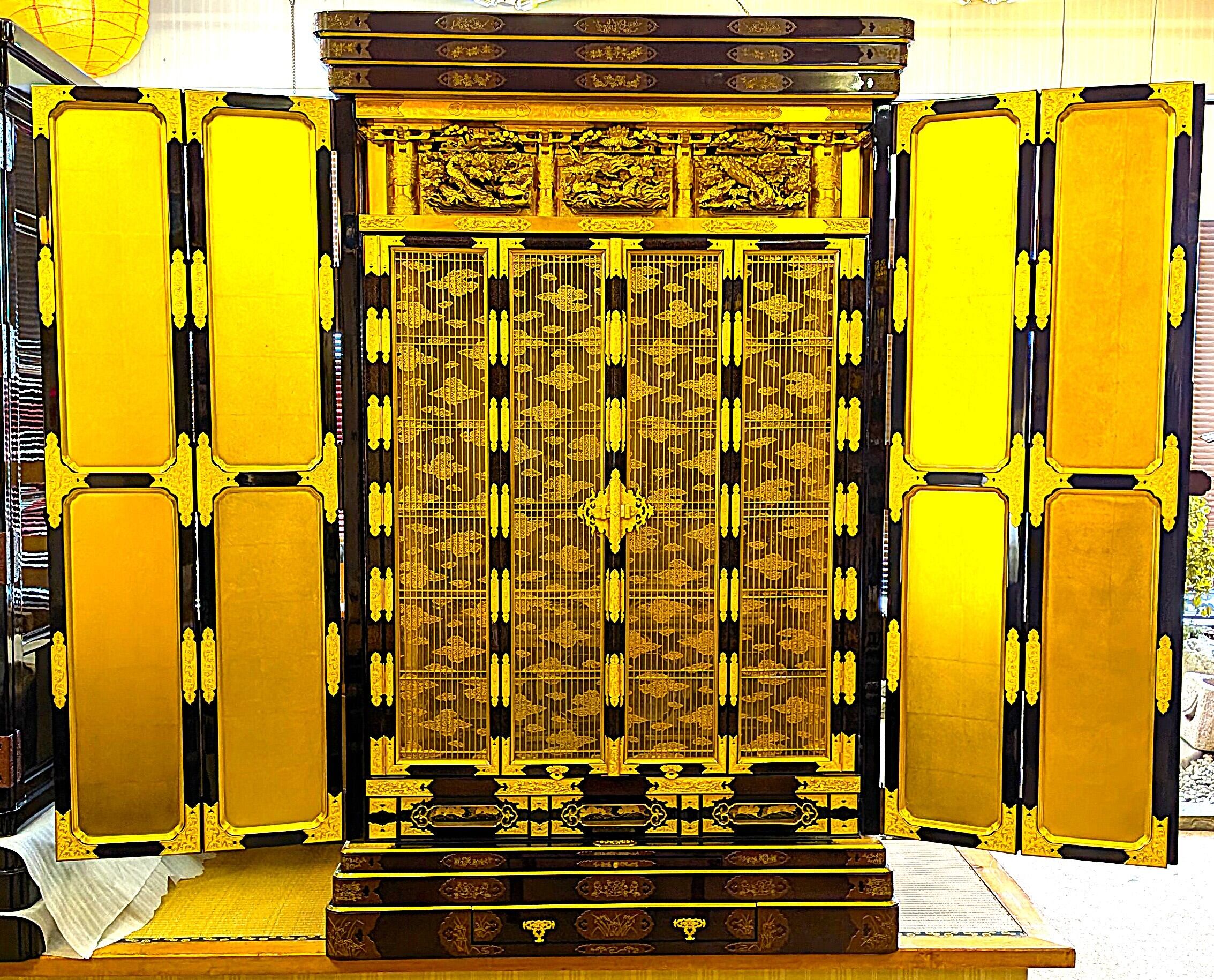 【スペック】高さ:176cm/幅:111cm/奥行:75cm/特徴:大型の本金仏壇、仏具付き