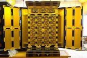 この金仏壇は、大型の本金を用いており、圧倒的な存在感を誇ります。その精緻な彫刻と美しい金箔仕上げにより、神聖な空間を演出し、心を込めたお祈りをより特別なものにすることでしょう。三方開のデザインは、開放感を与えつつ、上品な雰囲気を漂わせます。