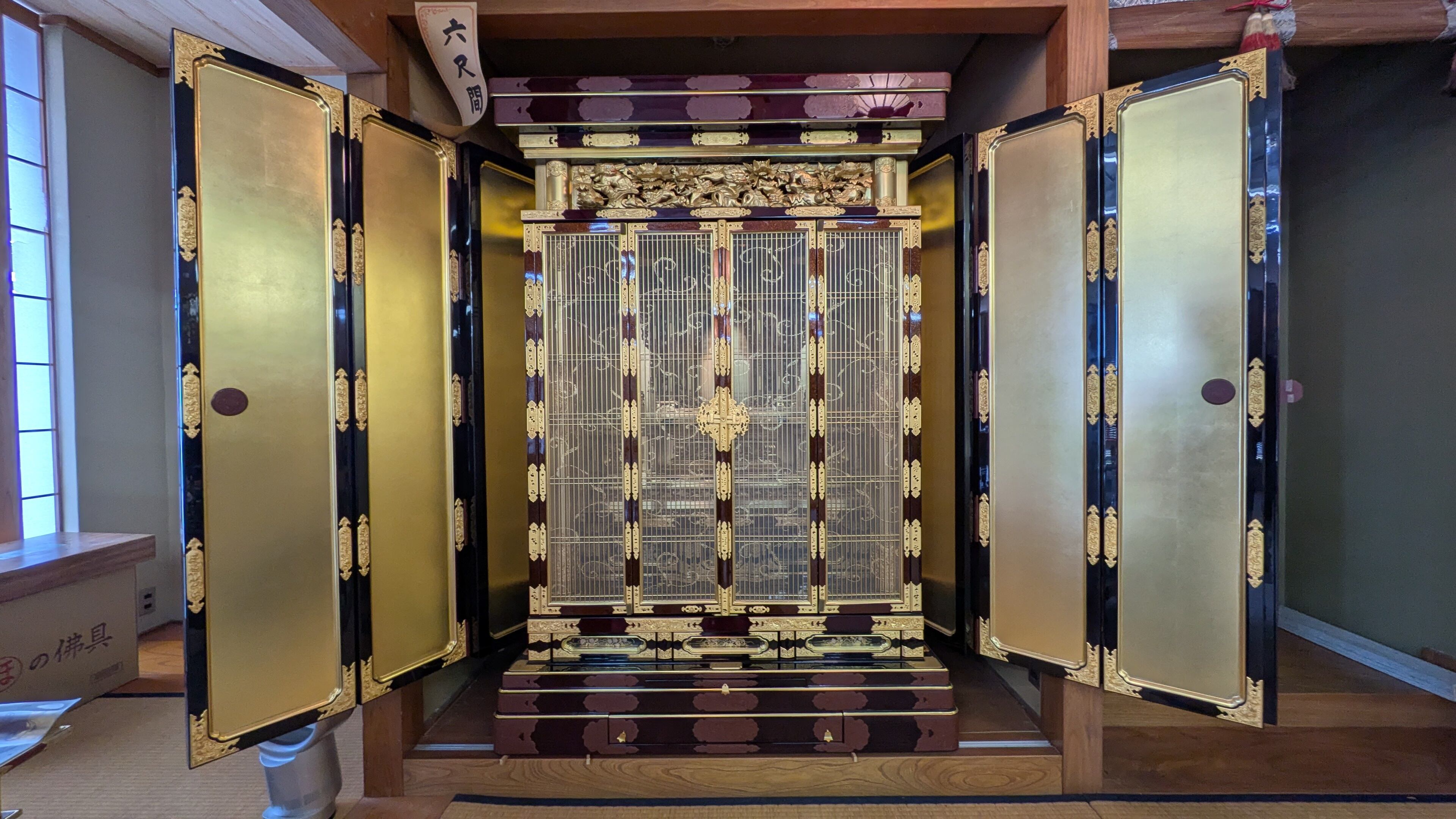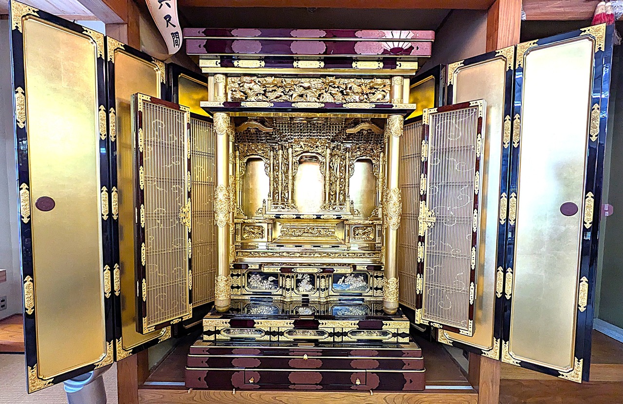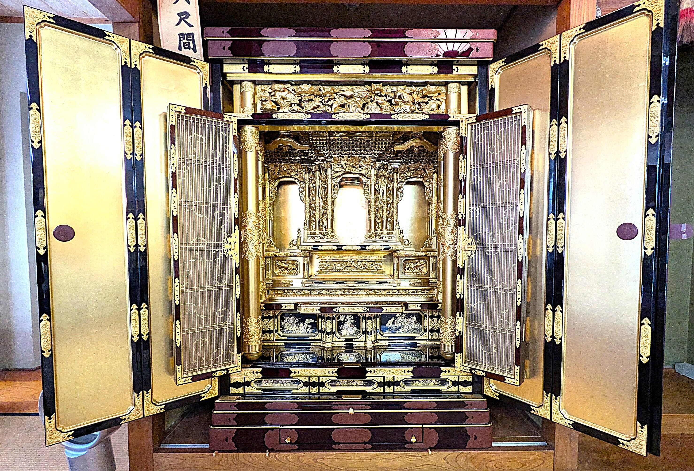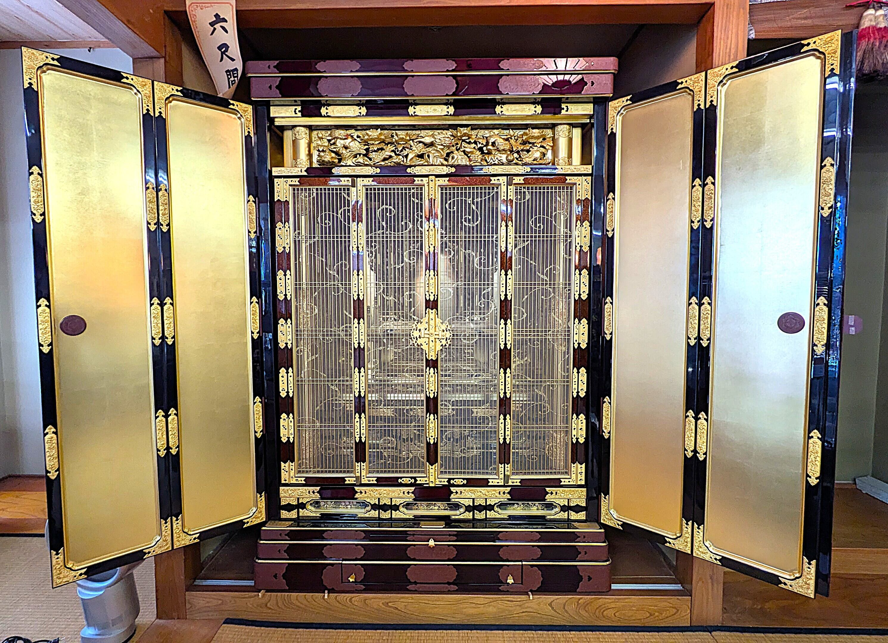 【スペック】高さ:177cm/幅:124cm/奥行:78cm/特徴:大型の本金仏壇、仏具付き