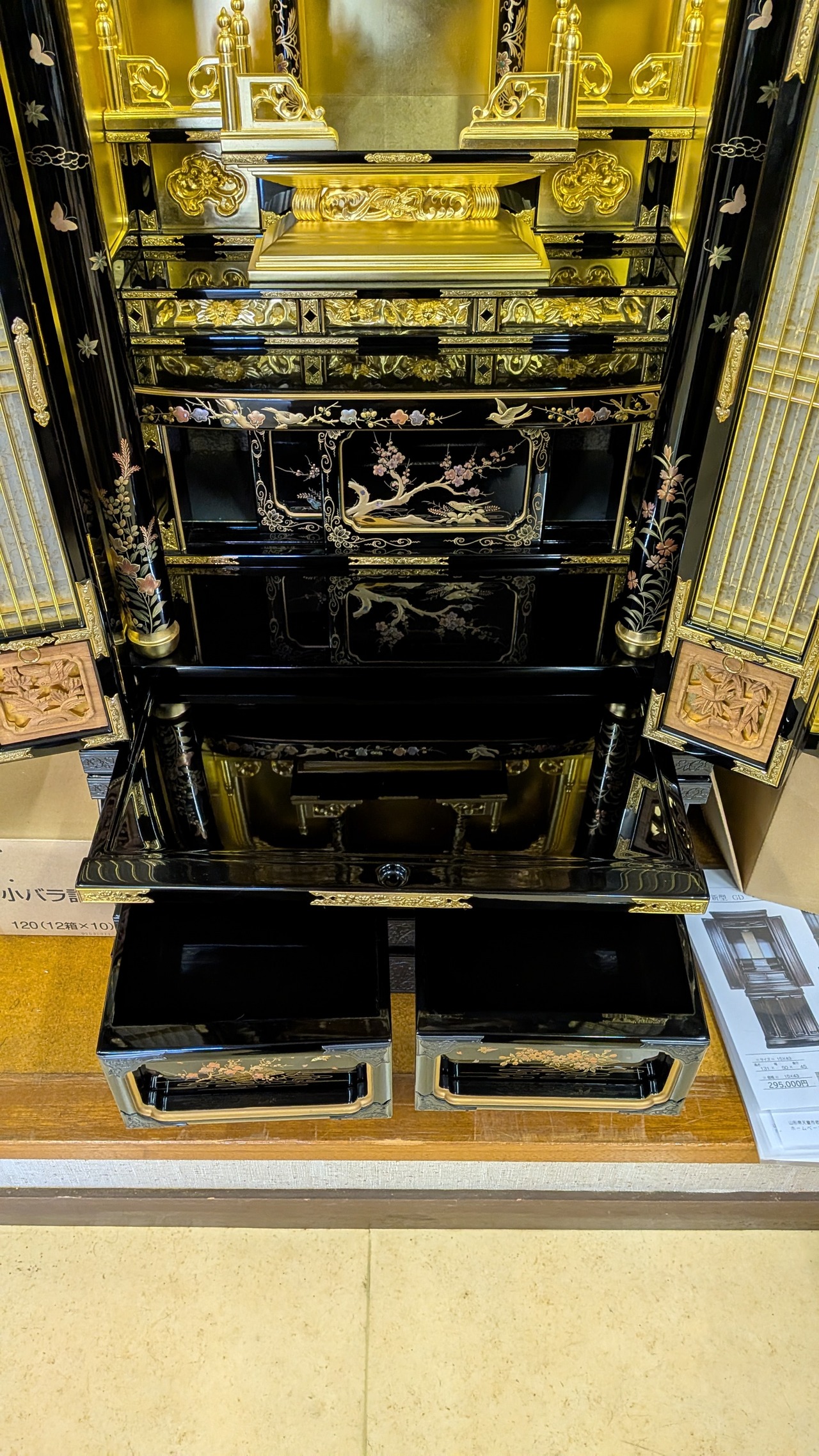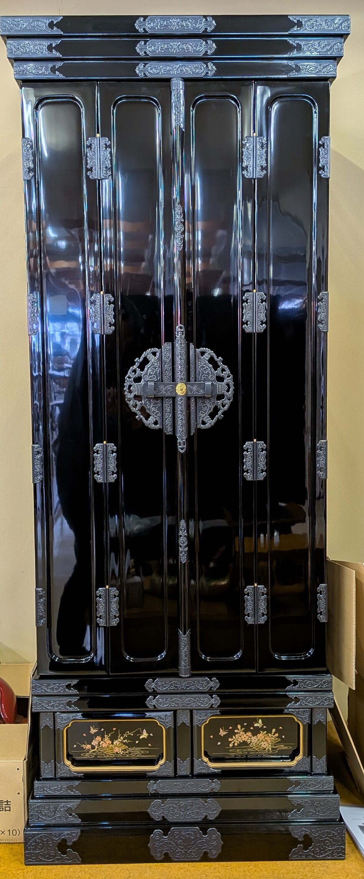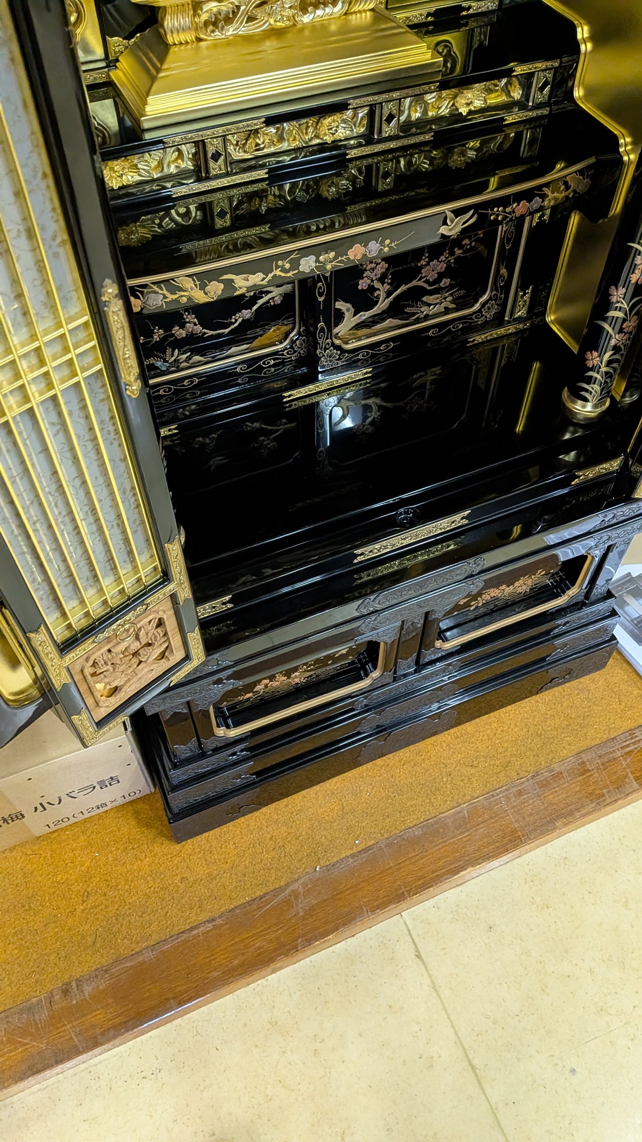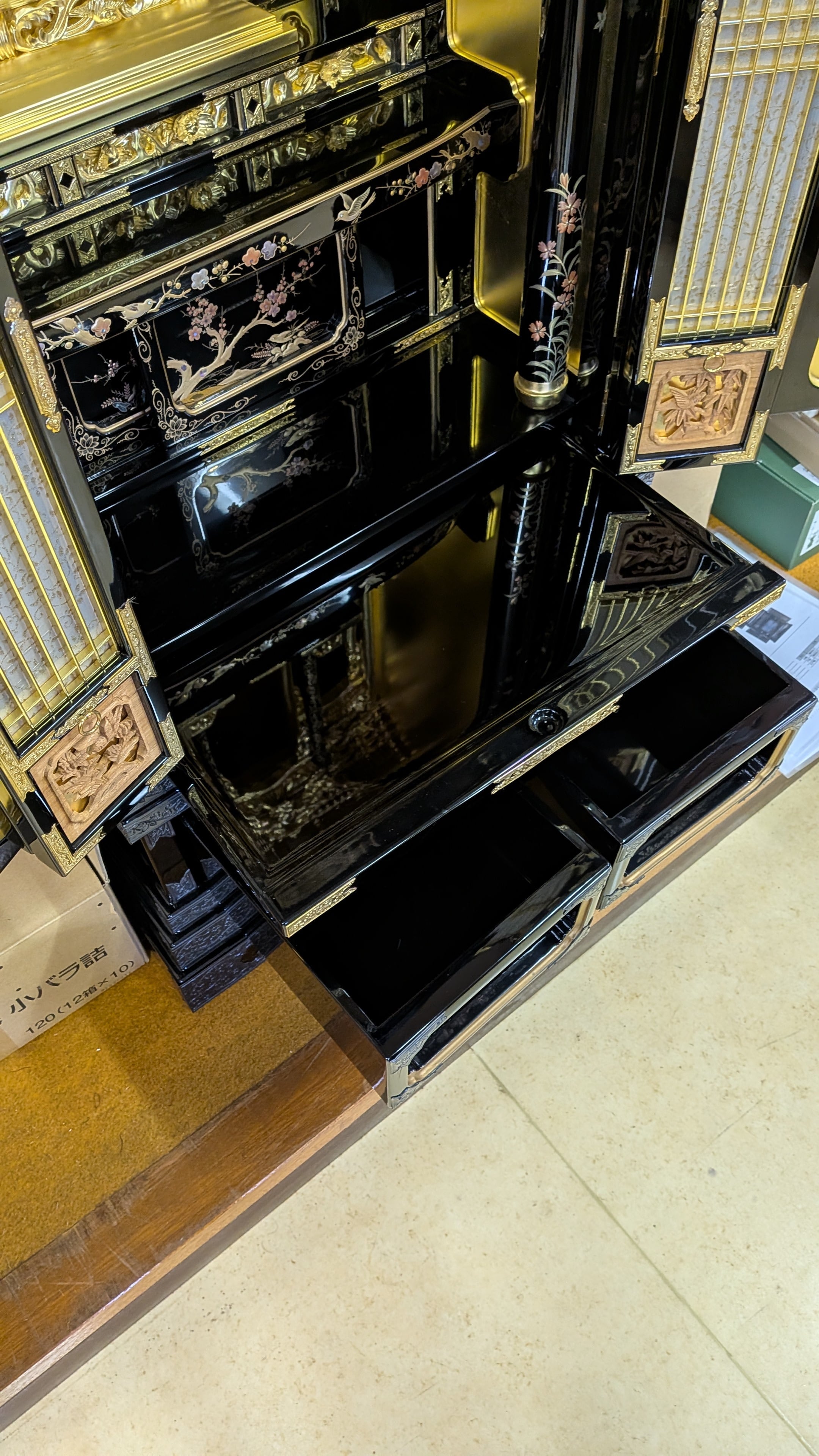 【スペック】高さ:149cm/幅:59cm/奥行:48cm/特徴:白木彫りと蒔絵が調和した仏壇、仏具付き