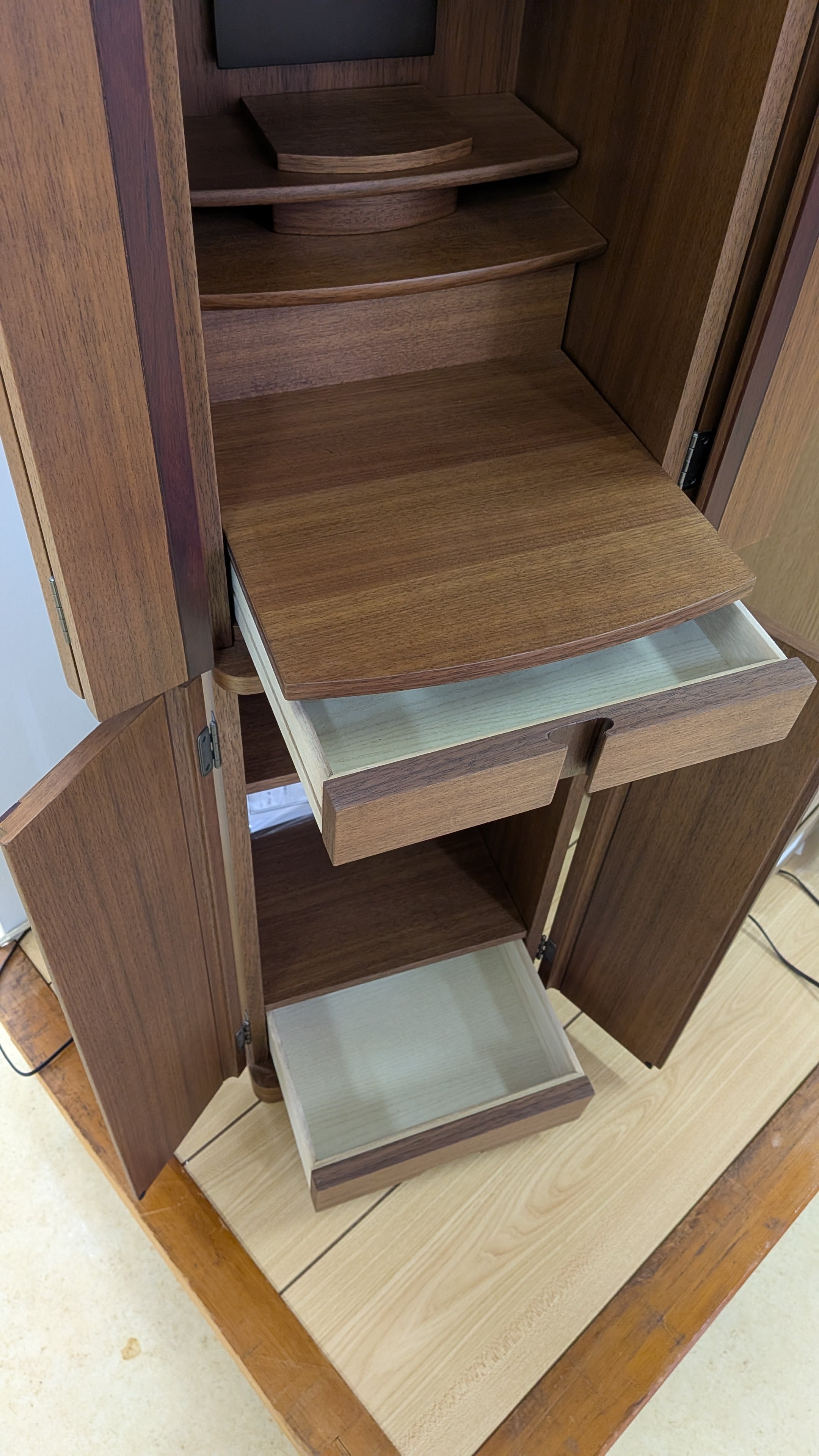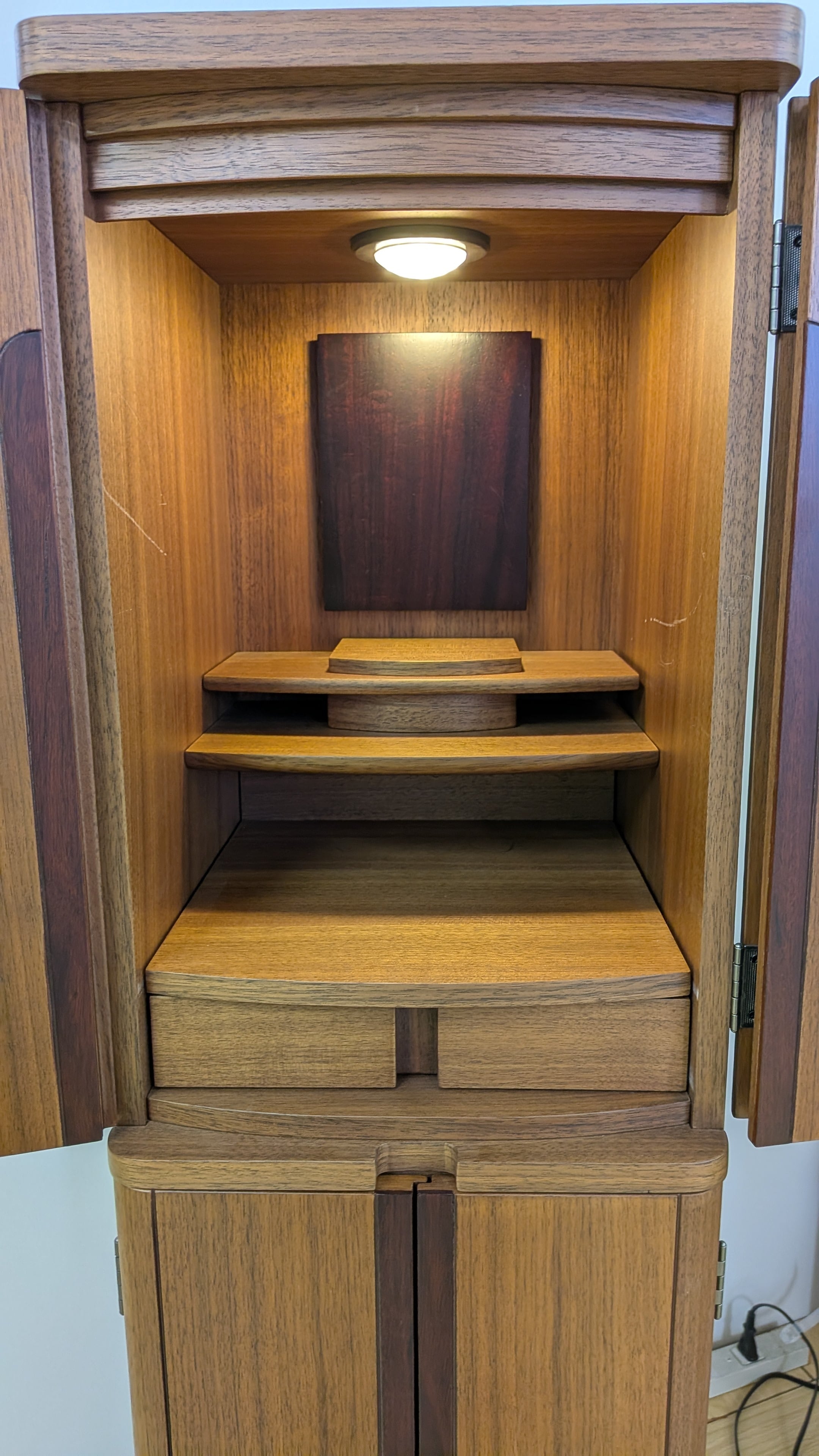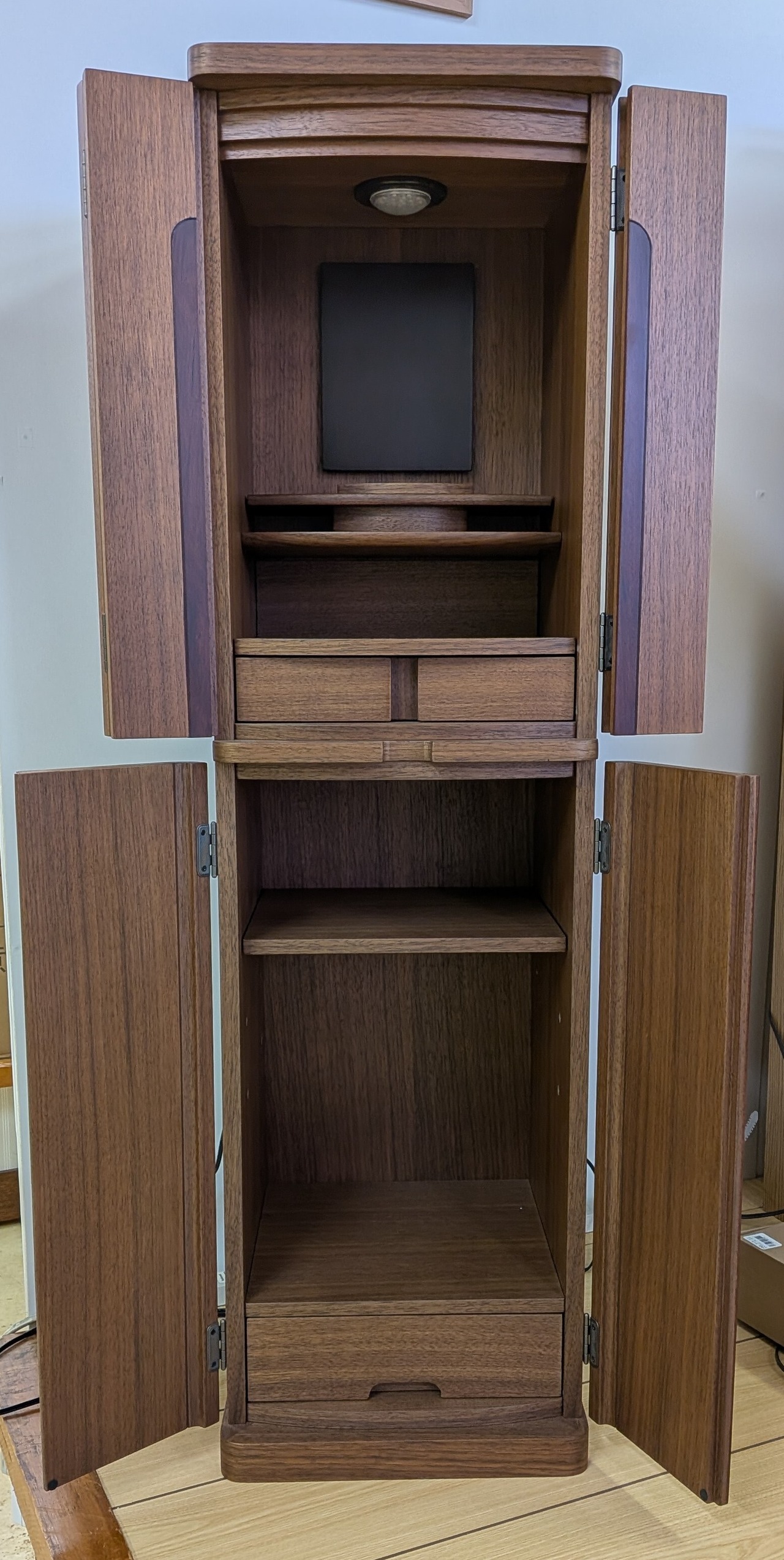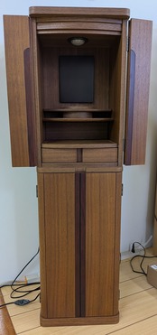 【スペック】高さ:110cm/幅:31cm/奥行:30cm/特徴:ウォールナット材使用、骨箱収納可能、仏具付き