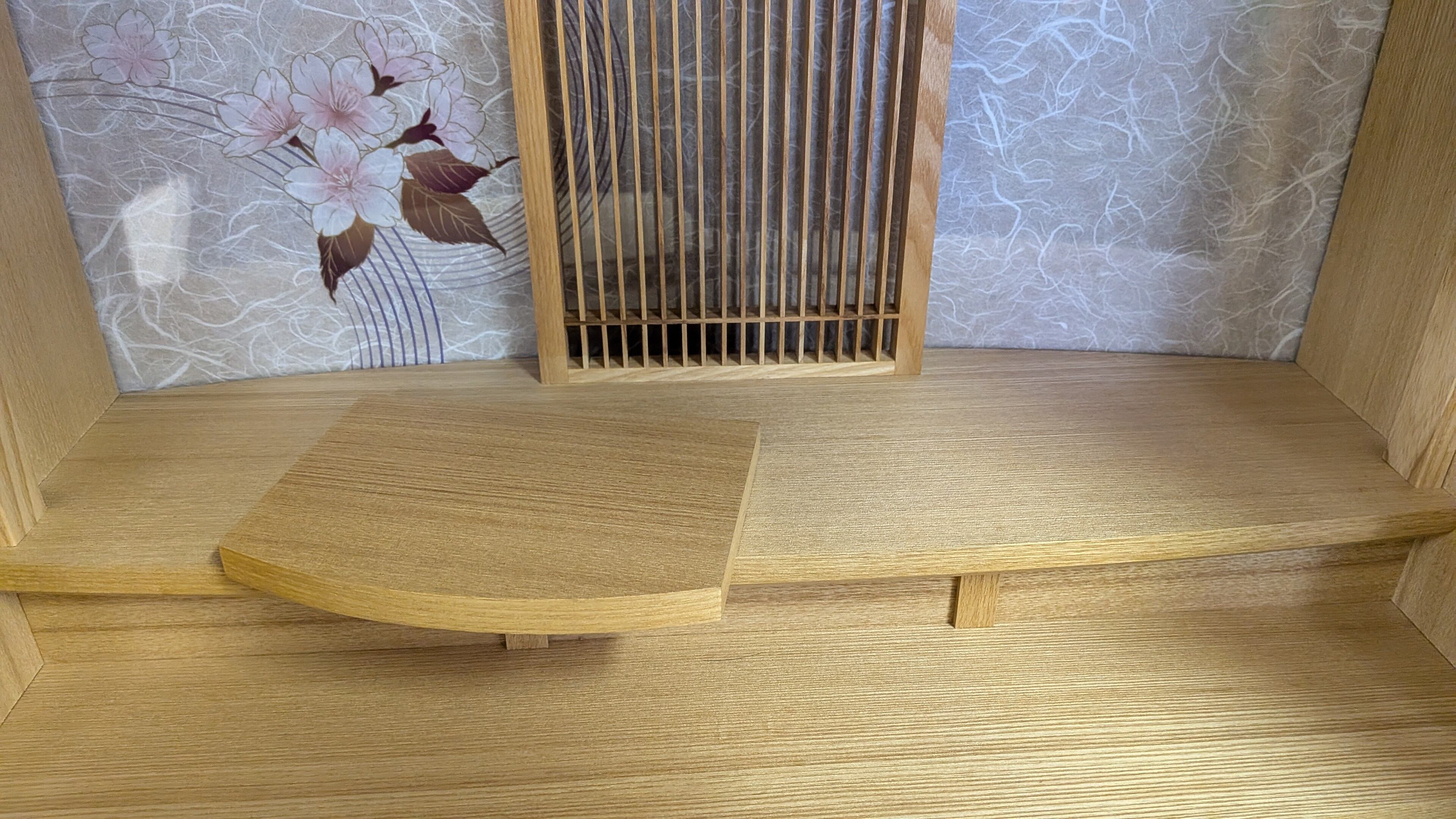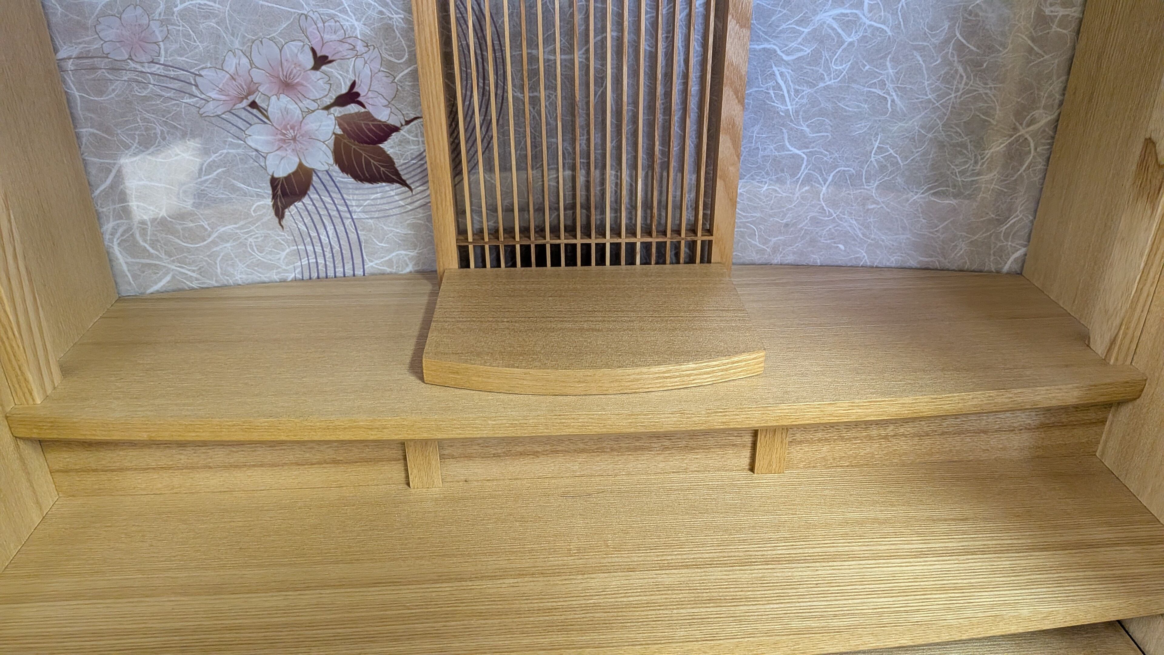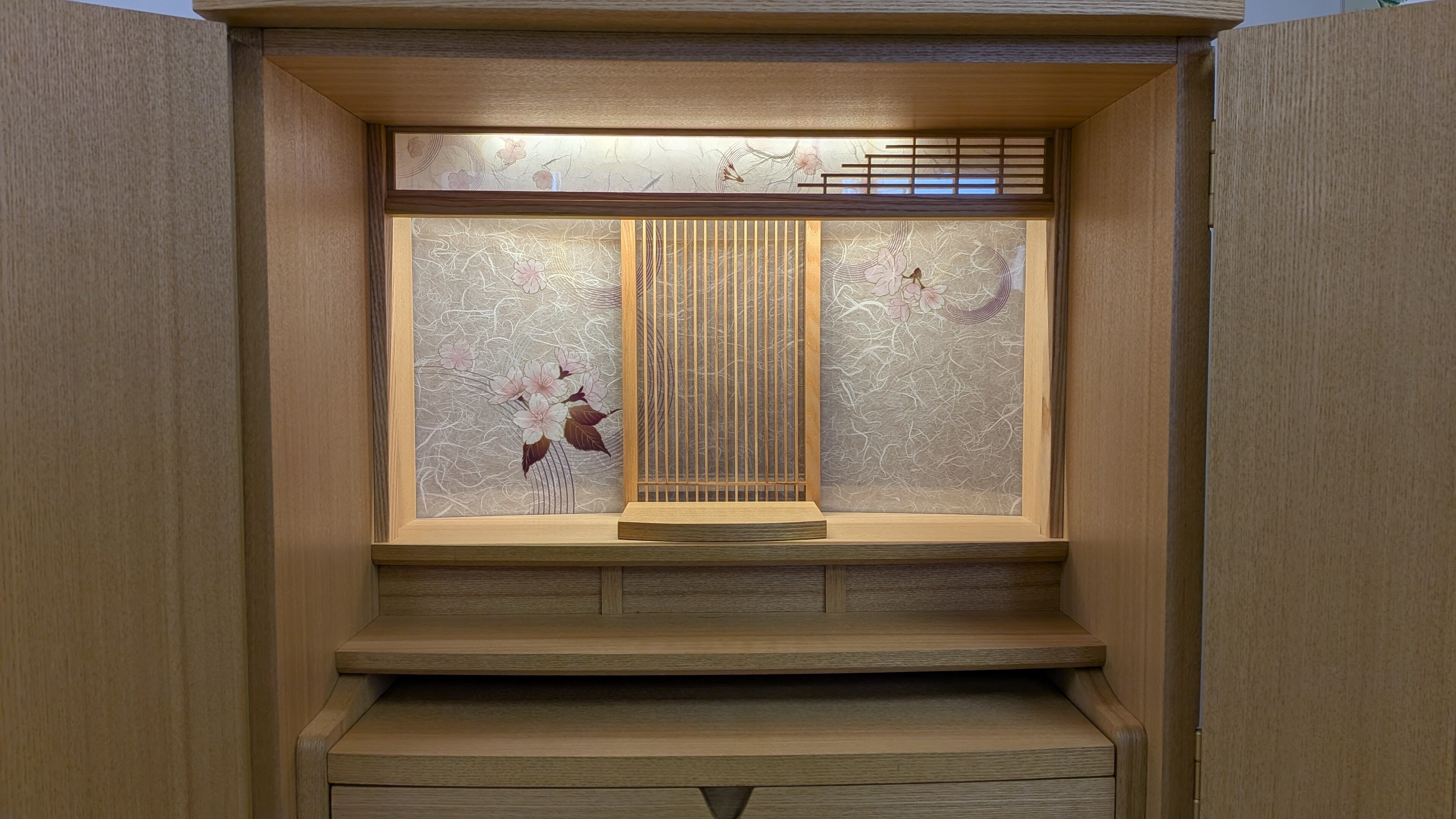 【スペック】高さ:55cm/幅:55cm/奥行:37cm/特徴:タモ材使用、桜を随所に彩ったデザイン、仏具別