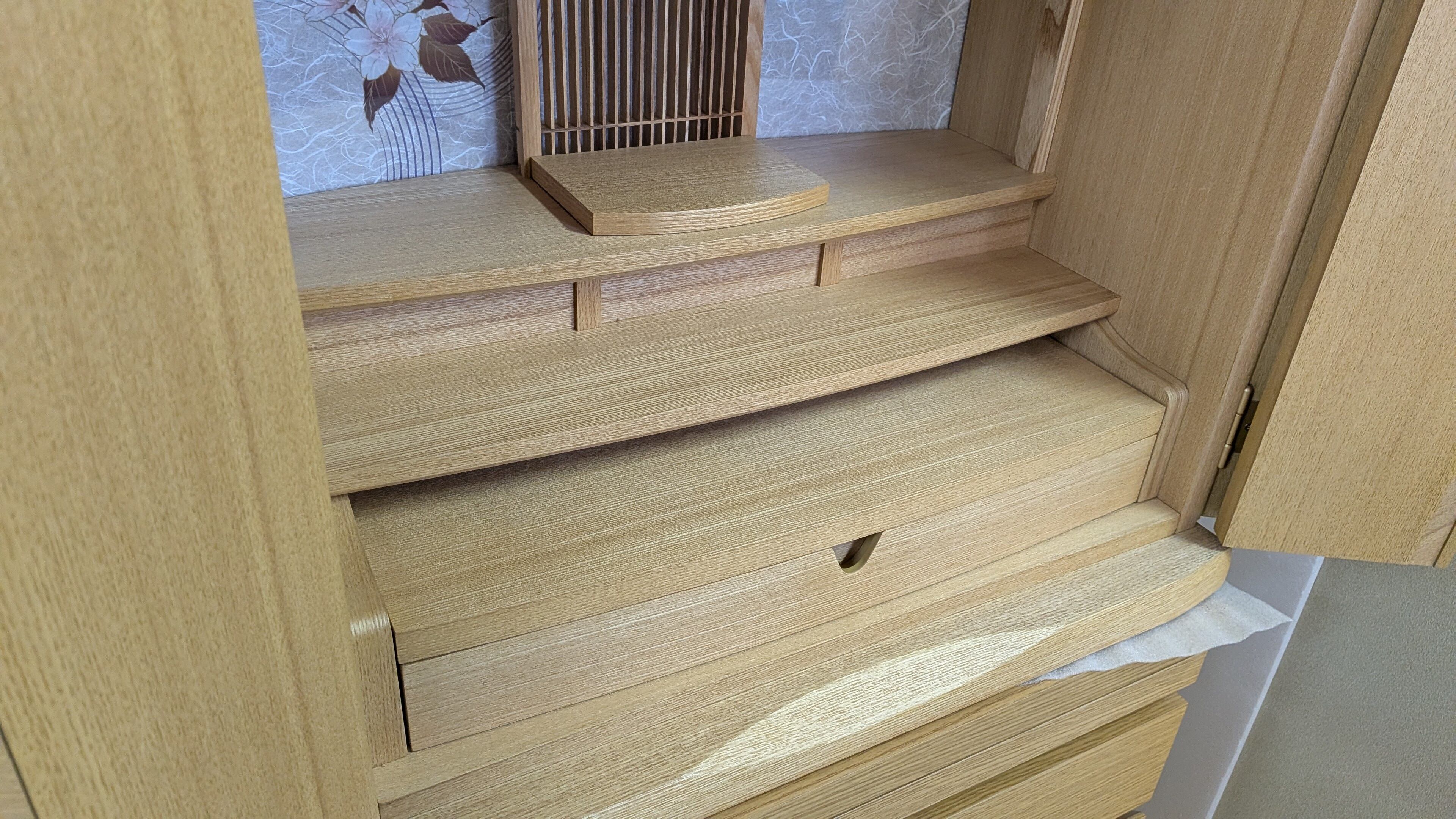 この上置仏壇は、美しいタモ材を使用しており、温かみのあるナチュラルな色合いが心を和ませます。桜を随所に彩ったデザインは、視覚的にも楽しませてくれるだけでなく、心の安らぎを与える特別な存在感を放っています。コンパクトながら、確かな存在感を持ち、お部屋のどこにでも馴染むデザインです。