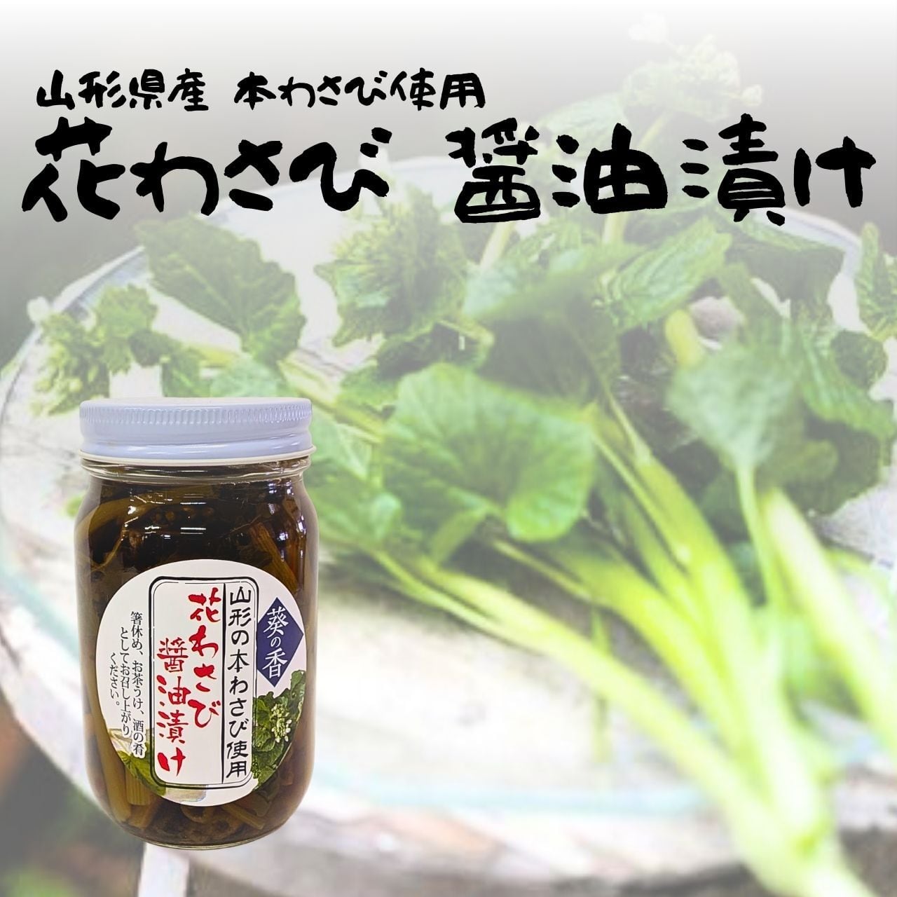 原材料:本わさび茎と葉(山形県産)、漬け原材料(醤油。みりん、砂糖、かつおぶしエキス、りんご酢、こんぶエキス、しいたけエキス、酵母エキス)(一部に大豆・小麦を含む)